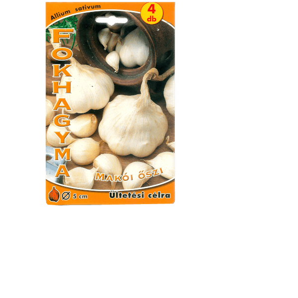 Makói, őszi fokhagyma 4db/csomag kiszerelésben. A nagy hagyományú, értékes makói fokhagyma közepes hagymaméretű, szürkésfehér héjazatú. A hagymát 5-8 gerezd alkotja. Erőteljes íze miatt kiváló fűszerező értékű. Sokáig, jól tárolható.