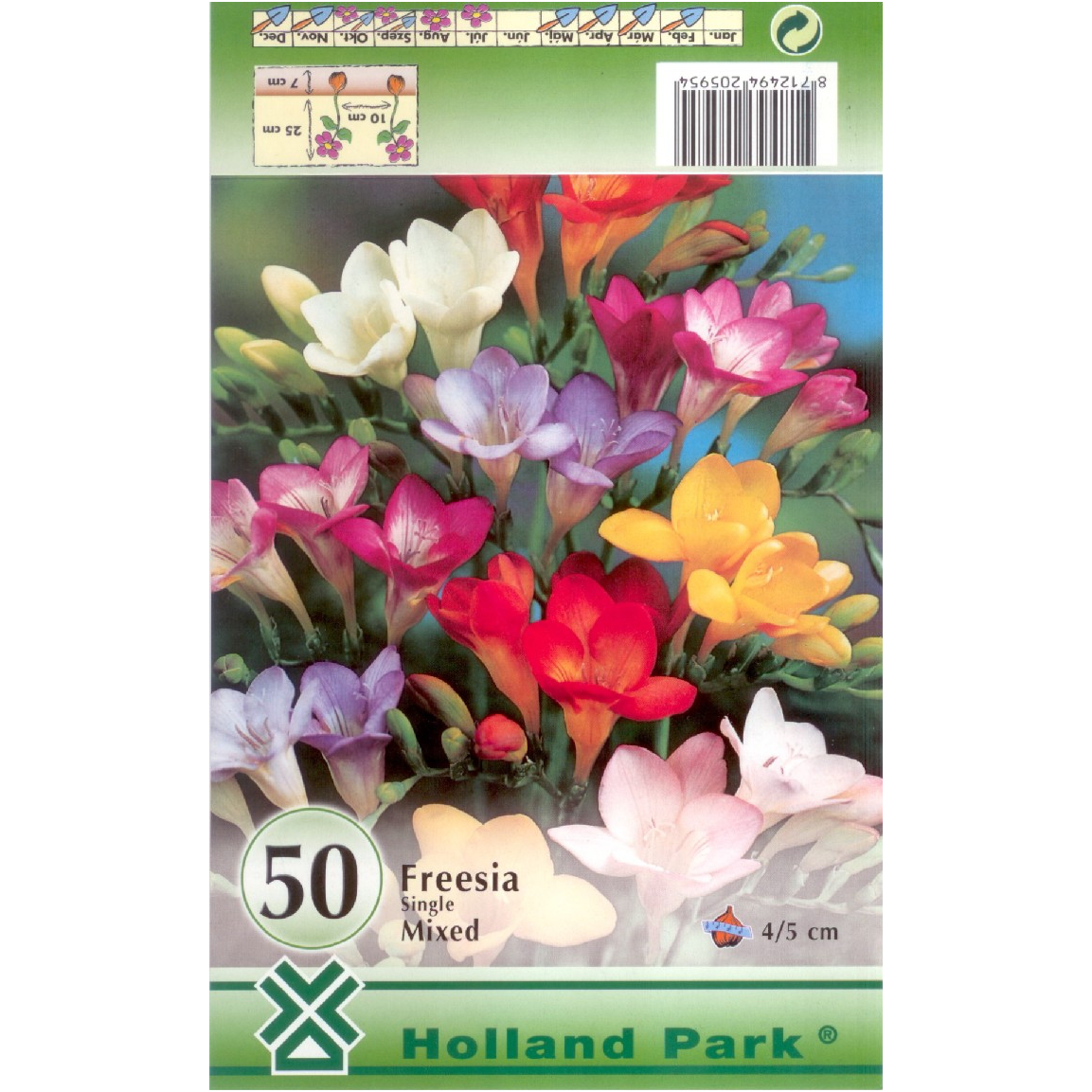 Frézia szimpla mix, vegyes színekben. A csomag 50db virághagymát tartalmaz. Február-május, vagy szeptember-december környékén érdemes elültetni, figyelve arra, hogy félárnyékot kedvelő növény.