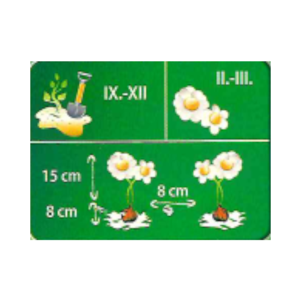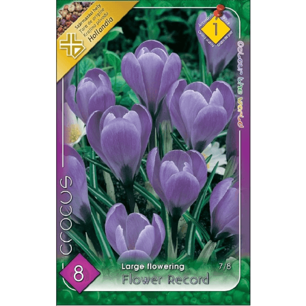 Crocus large flowering flower record virághagyma, egy csomag 8 db hagymát tartalmaz. Napos vagy enyhén félárnyékos helyet kedveli. A hagymákat csúcsukkal felfelé 5-8 centiméter mélyre szükséges ültetni, jó vízáteresztésű talajba.