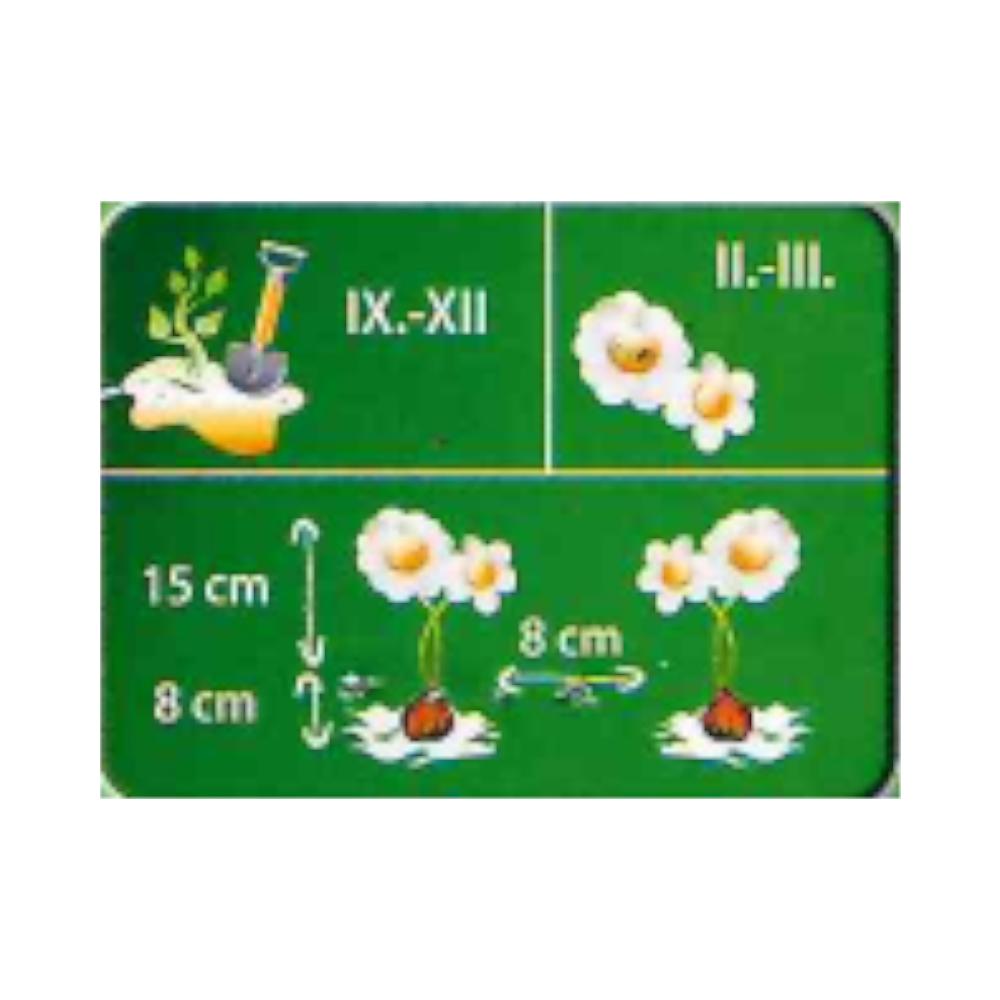 Egy csomag 8db virághagymát tartalmaz. Enyhén félárnyékos helyet kedveli. A hagymákat csúcsukkal felfelé 5-8 centiméter mélyre szükséges ültetni, jó vízáteresztésű talajba. A képek tájékoztató jellegűek!