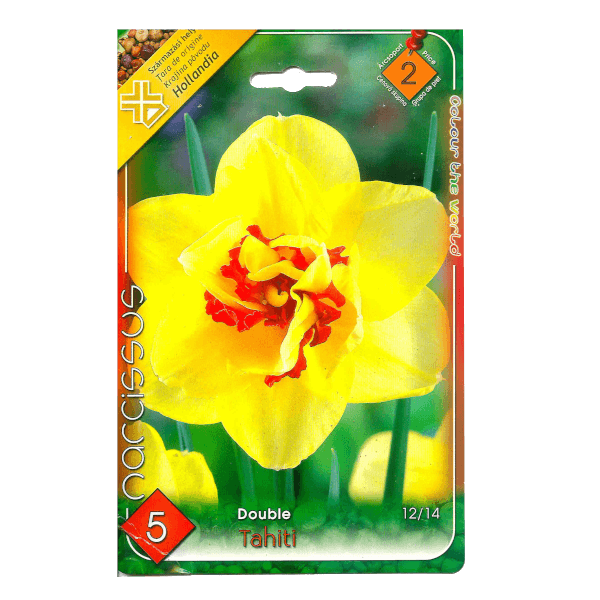 Nárcisz virághagyma (narcissus tahiti). Szinte minden talajon jól fejlődnek. Szeptembertől decemberig ültethetők. Legszebbek nagyobb önálló csoportokba vagy ágyásba ültetve. Kiválóak vágott virágnak is!
