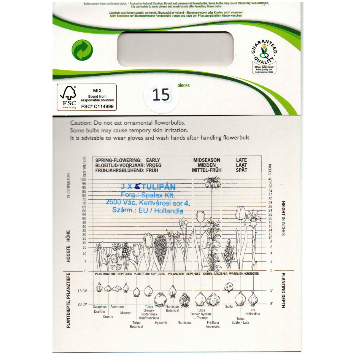 A 11/12-es méretű hagymák korai és késői virágzású fajtákat is tartalmaznak, így hosszabb ideig gyönyörködhetsz a színes tulipánokban. Áprilistól májusig díszítik a kertet, de vágott virágként is mutatósak.