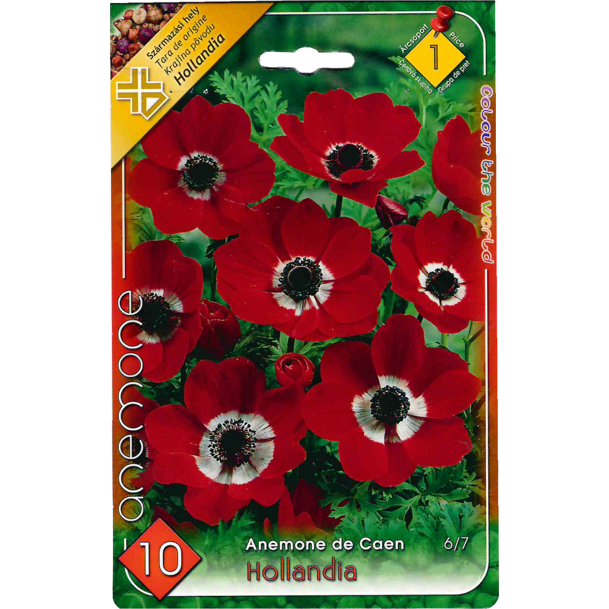 Anemone de Caen Hollandia Koronás szellőrózsa, egy csomag 10 db viráhagymát tartalmaz. Fénykedvelő növény, de lehetőség szerint inkább félárnyékba legyen ültetve, a telet állja. Sziklakertben, illetve évelő ágyásokban a legoptimálisabb felhasználni, de vágott virágként tökéletes ajándék, illetve dísze lehet a lakásnak. Május-július virágzik.