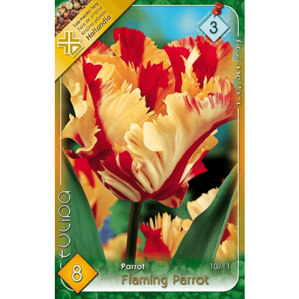 Tulipa Flaming Parrot virághagíma, 8db van egy csomagolásban. Kifejezetten késői virágzású, 50 cm szárhosszúságú, sajátos, feltűnő virágformájú és színű tulipánok. Különleges virágja miatt nagyon szeles, kitett helyre ne telepítsük. Ültessük mindig csoportokba, védett helyre. Ültetés szeptembertől decemberig.