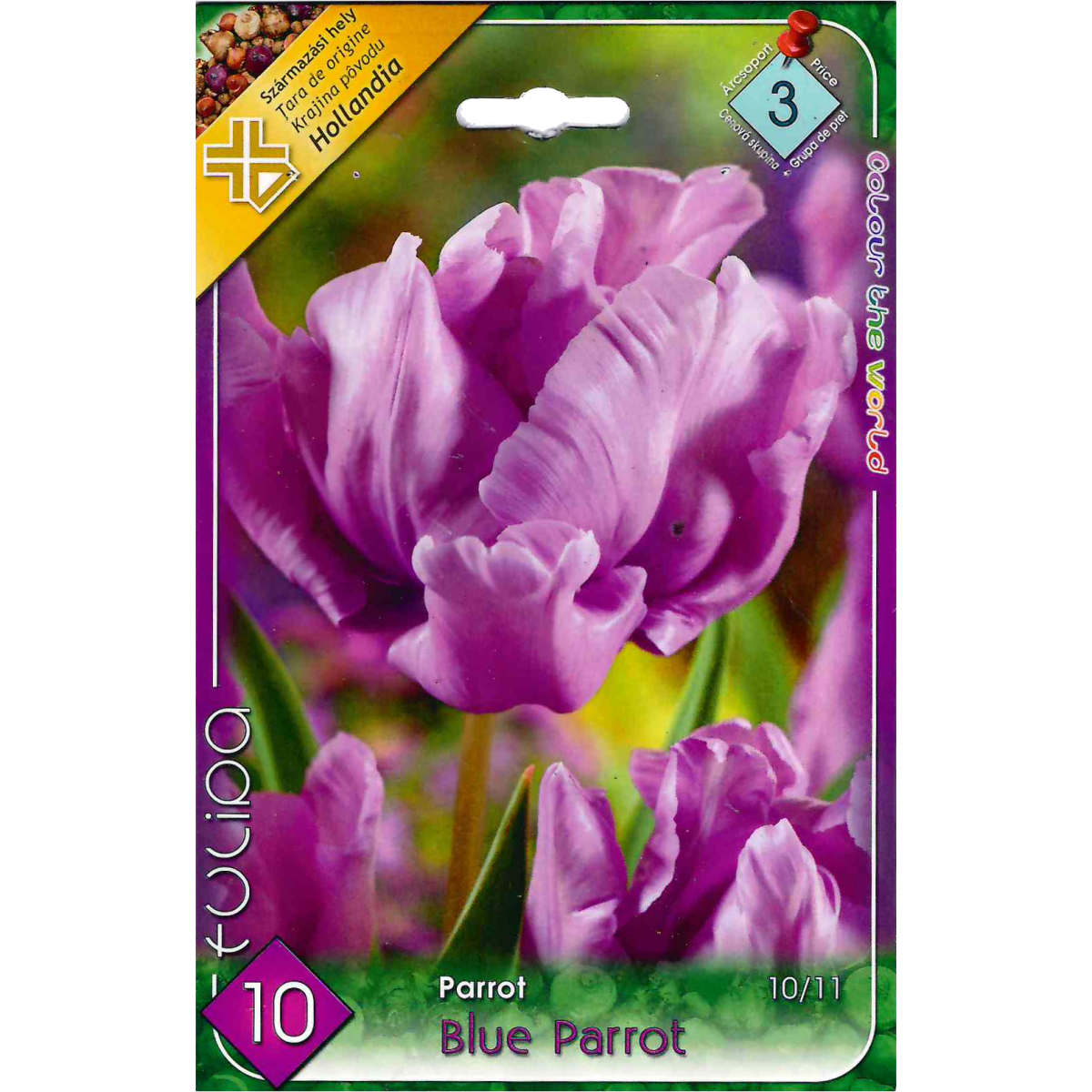 'Blue Parrot' tulipán virághagyma. Egy csomagban 10 darab hagyma. Mérete 10-11 cm-es. Kifejezetten késői virágzású, 50 cm szárhosszúságú, sajátos, feltűnő virágformájú és színű tulipánok. Különleges virágja miatt nagyon szeles, kitett helyre ne telepítsük. Ültessük mindig csoportokba, védett helyre. Ültetés szeptembertől decemberig.