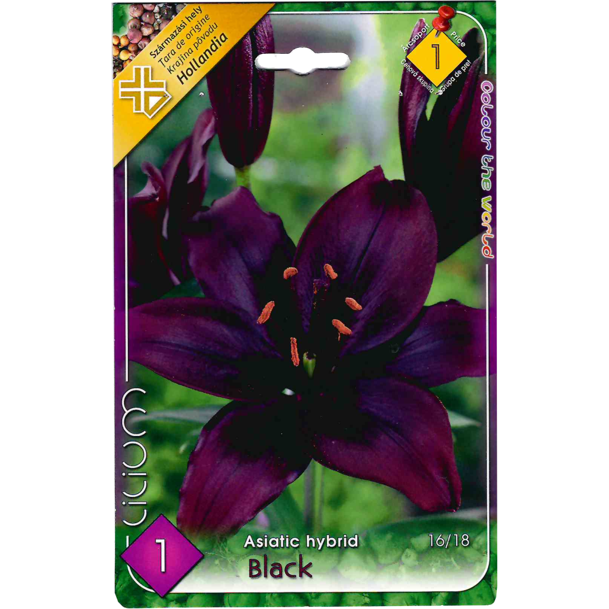 Egy csomag 1 darab virághagymát tartalmaz. Méret:16/18. Fekete ázsiai hybrid liliom. Nyáron virágzó, egzotikus növény. Pompás dísze a kerteknek, alkalmas díszcserjék közötti virágos foltok kialakítására, de vágott virágnak is. Mindenféle pangó víztől mentes talajon megél, de legjobban a mélyen művelt, tápdús földben fejlődik. Szellős, levegős helyet, de nem tűző napot kedvel. Ültetés ősszel vagy tavasszal, télálló, így több évig egy helyben hagyható.