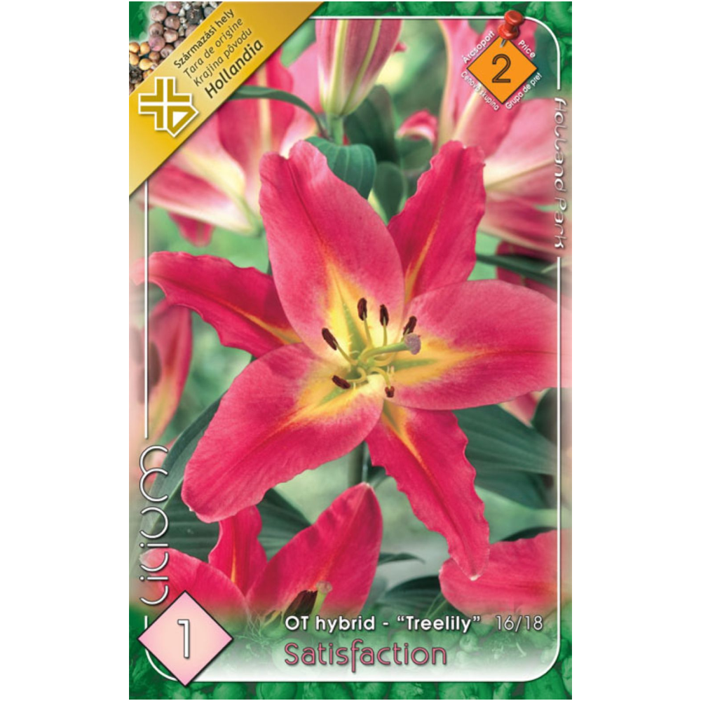 Az óriás liliom ‘Satisfaction’ (liliomfa) igazán látványos, különleges dísznövény, amely hatalmas termetével és feltűnő piros–sárga virágaival a kert egyik legimpozánsabb eleme lehet. Erős szárain nagyméretű, illatos virágokat hoz, amelyek vágott virágként is rendkívül dekoratívak.