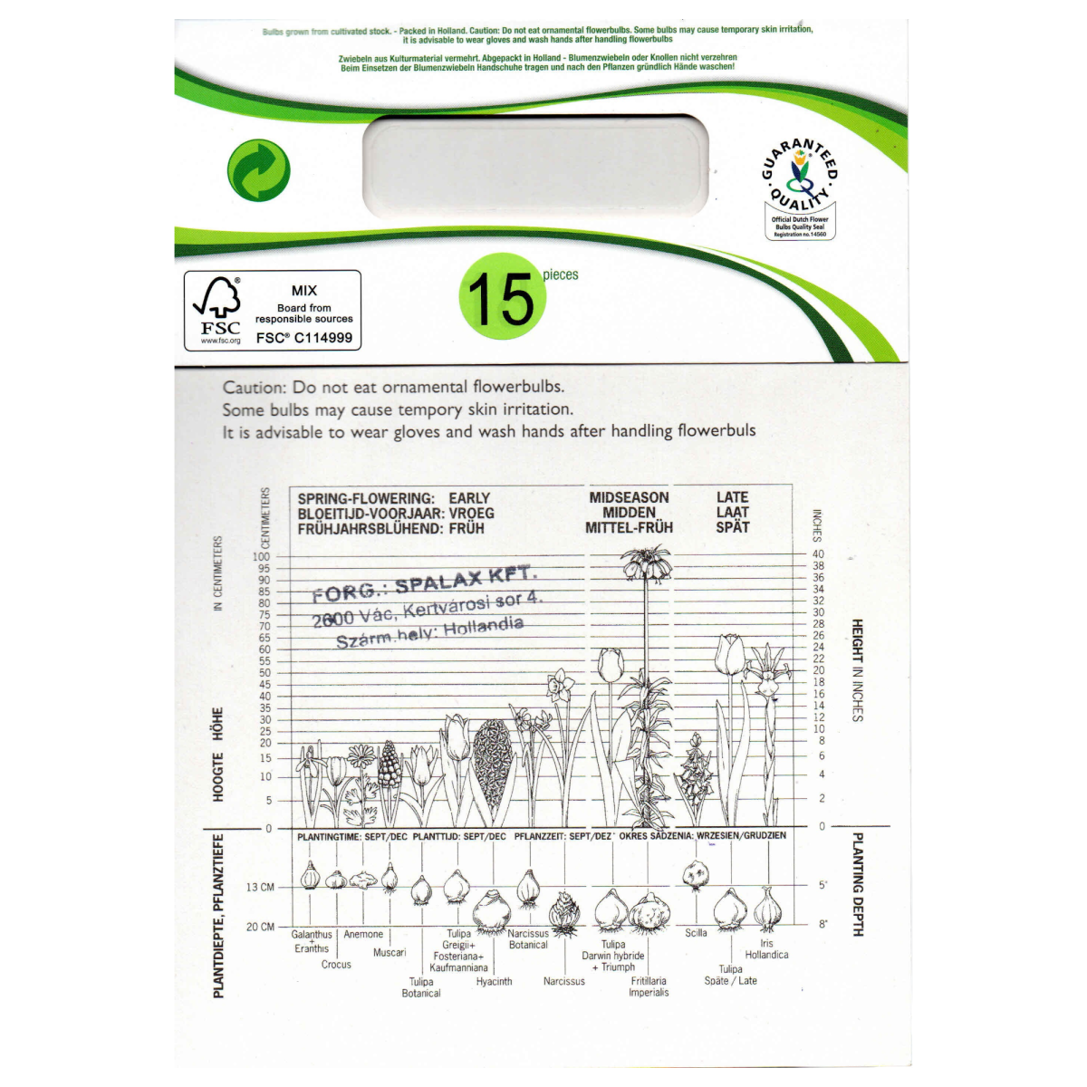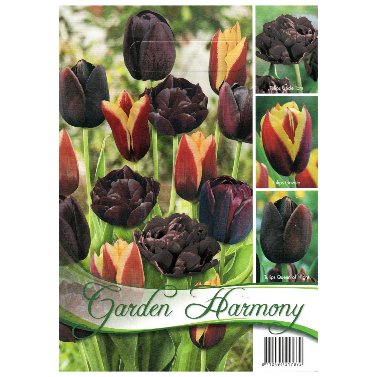 Ez a fekete színárnyalatú tulipánválogatás három különleges fajtát tartalmaz, amelyek elegáns, mély tónusokkal és látványos kontrasztokkal díszítik a tavaszi kertet. A csomagban 5 db ‘Uncle Tom’ késői dupla, 5 db ‘Triumph Gavota’ és 5 db ‘Triumph Queen of Night’ késői szimpla hagyma található, mind 11/12-es méretben. Ültetve harmonikus, mégis változatos szín- és formavilágot nyújtanak.