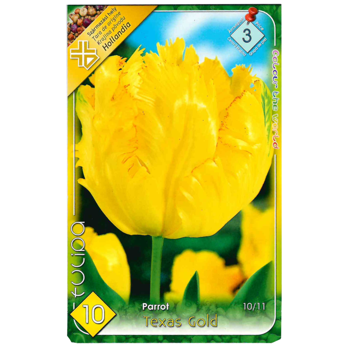 Texas Gold sárga virágú késői virágzású tulipán virághagyma. Kifejezetten késői virágzású, 50cm szárhosszúságú, sajátos, feltűnő virágformájú. Lepelleveleik mélyen rojtosak, hullámosak, csavarodottak, esetenként egészen bizarr megjelenésűek. Különleges virágja miatt nagyon szeles, kitett helyre ne ültessük. Ültessük mindig csoportokba, védett helyre. A képek tájékoztató jellegűek!