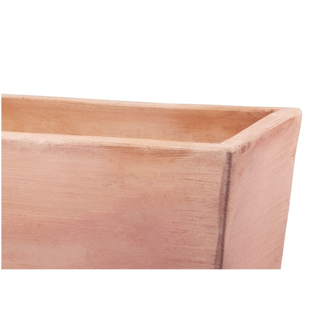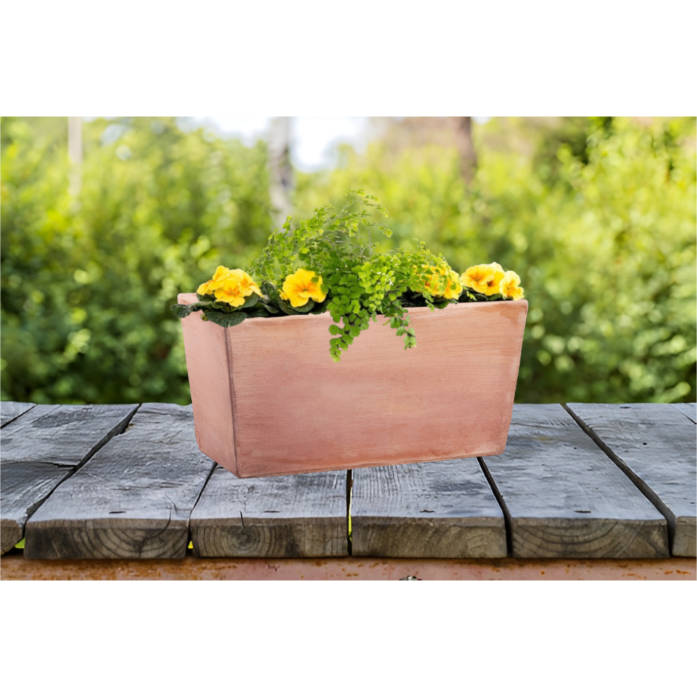 Moderne hosszúkás alakú, szögletes balkonláda. Autentikus megjelenésű, vörösesbarna, antikolt színű. Kiváló minőségű agyagból készült, jó vízmegtartó képességgel. Télálló tulajdonságának köszönhetően kültéren is alkalmazható az év minden szakában. Mérete: 20 cm x 50 cm x 20 cm. Súlya: 8 kg.