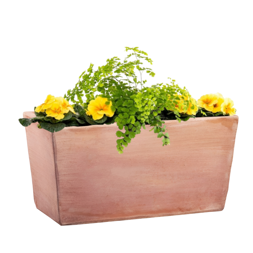 Moderne hosszúkás alakú, szögletes virágláda. Autentikus megjelenésű, vörösesbarna, antikolt színű. Kiváló minőségű agyagból készült, jó vízmegtartó képességgel. Télálló tulajdonságának köszönhetően kültéren is alkalmazható az év minden szakában. Mérete: 20 cm x 40 cm x 20 cm. Súlya: 7 kg.