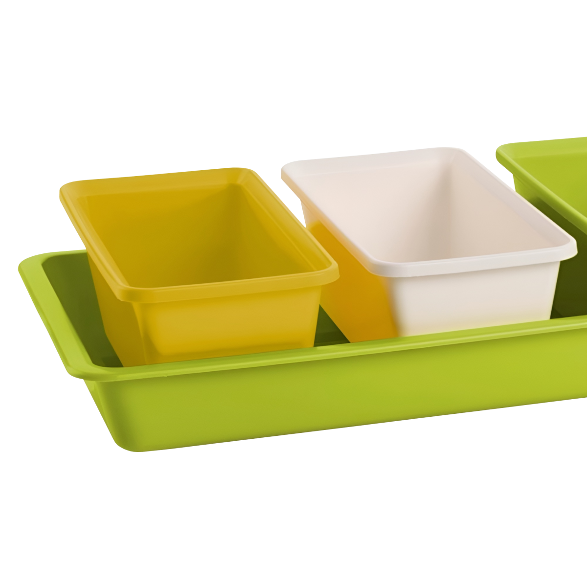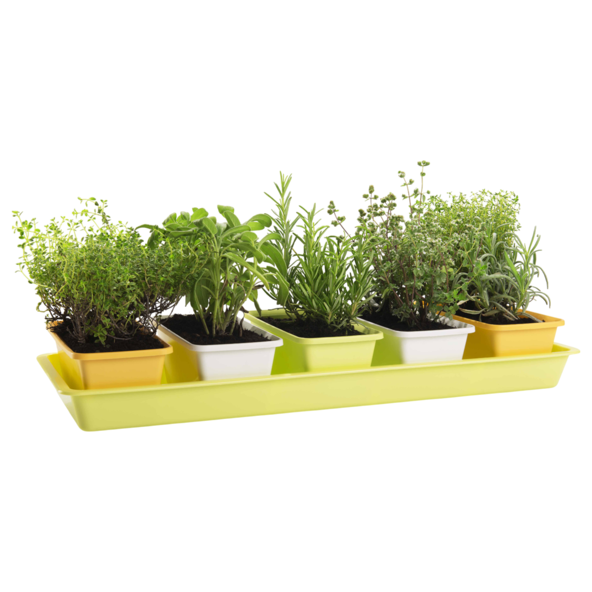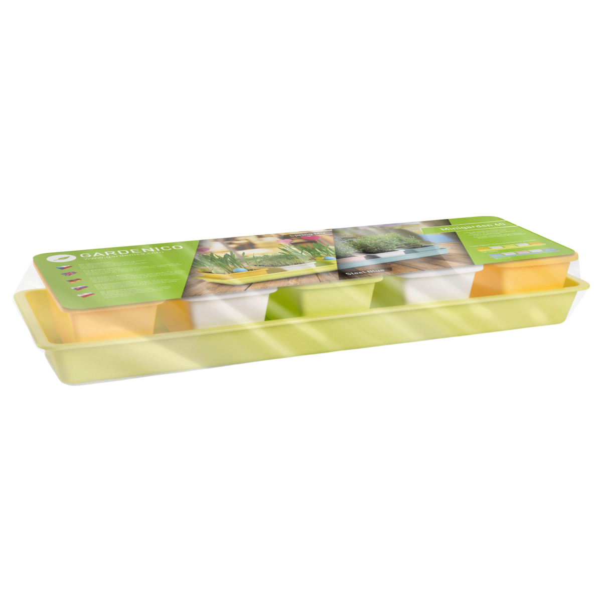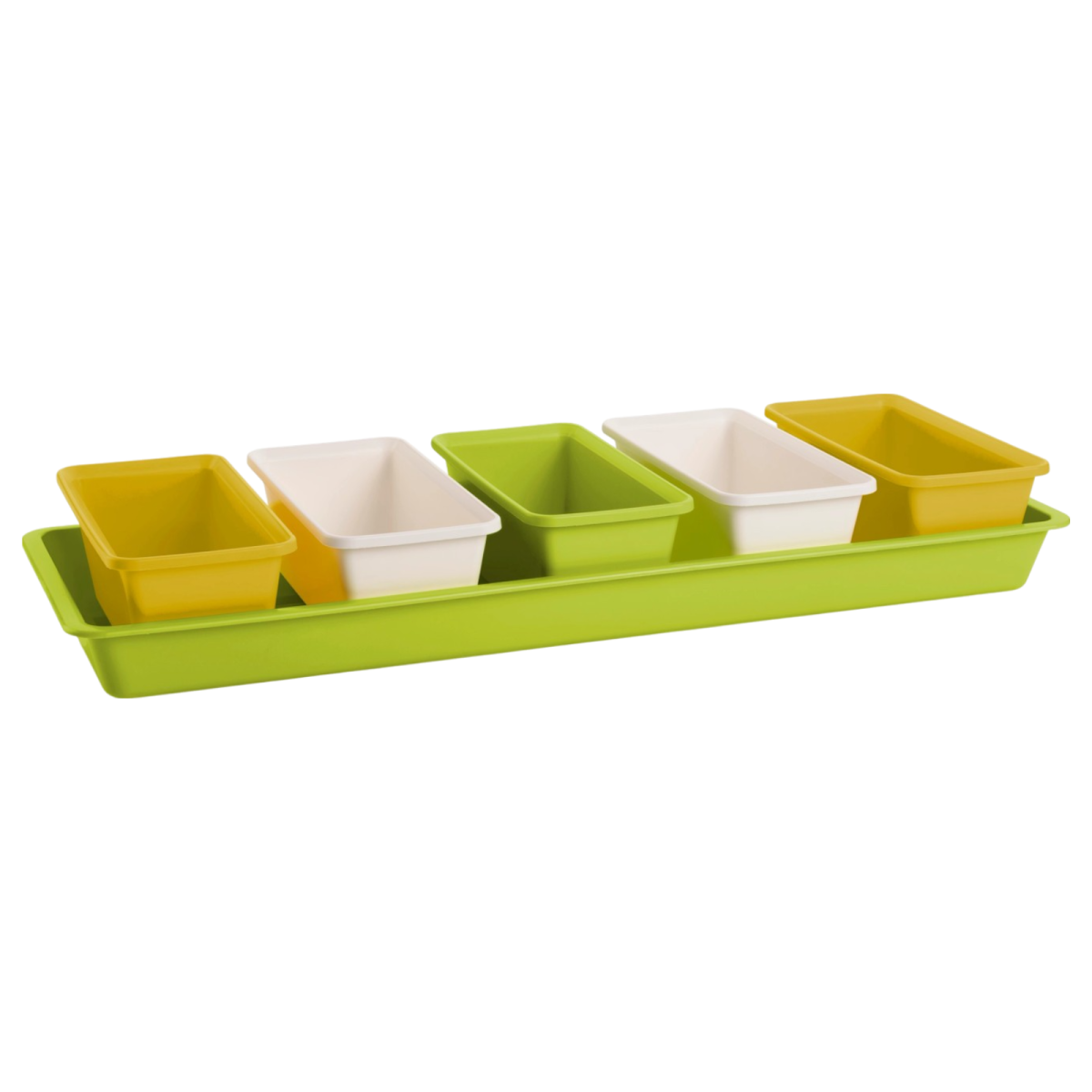 A készlet egy praktikus alátétből és 5 db színes ültetőedényből áll, amelyek stabilan elhelyezhetők a tálcában.