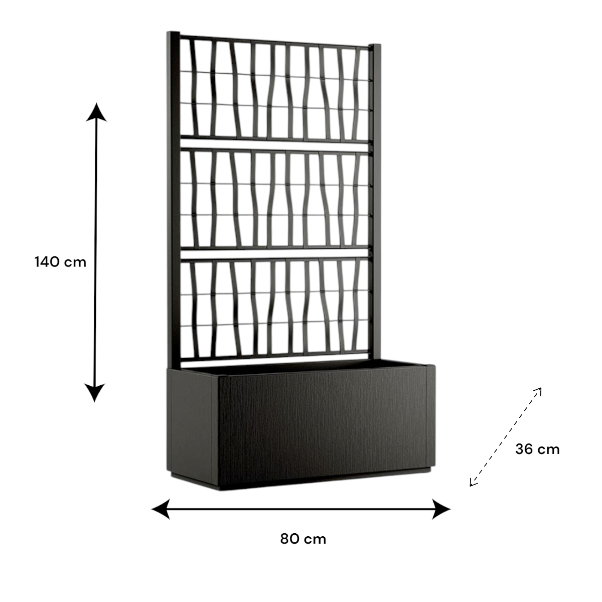 Az Ethica 80 cm-es grafit lugas egy modern, praktikus és modulárisan bővíthető megoldás futónövények és dísznövények számára. Az ültetőláda és a hozzá tartozó rács kombinációja helytakarékos módon biztosít stabil támaszt, miközben a növények dekoratív, függőleges elrendezését is megkönnyíti. A vízelvezető alj optimalizálja a gyökerek vízellátását.