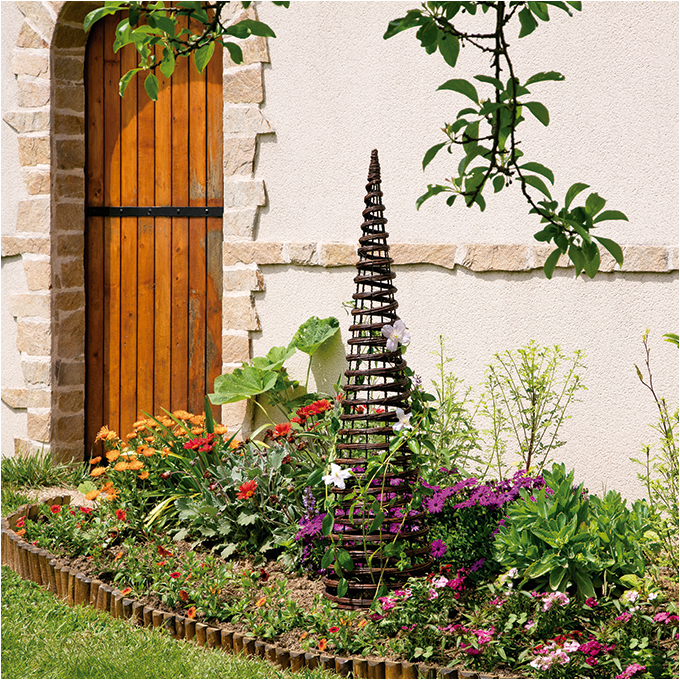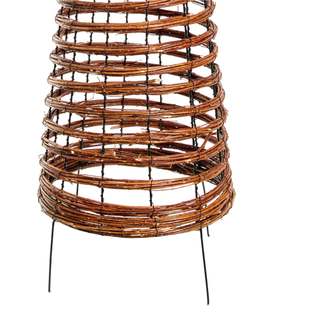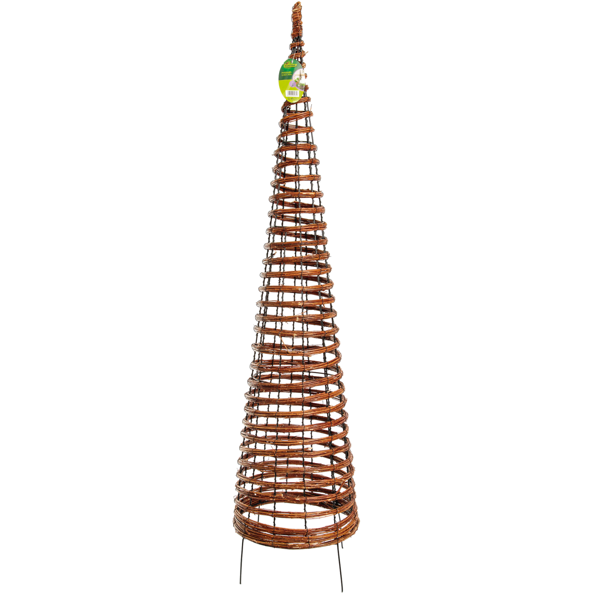 Természetes hántolatlan vesszővel borított piramis alakú növényfuttató, amely ötvözi a fémet és a természetes anyagot. Virágágyásba vagy cserépbe is helyezhető a futónövények számára, de magában is tökéletes, természetes megjelenésű díszítő eleme lehet kertjének, udvarának, teraszának. Alkalmazható stilizált karácsonyfaként is. Összeszerelést nem igényel, a talajon való elhelyezése egyszerű. Telepítéskor ajánlott először a futónövényt elültetni, majd a növénytámaszt a növény köré helyezni. Anyaga hántolatlan vessző, fém. Színe natúr. Mérete Ø 0,30 x 1,30 m. Lábak száma és mérete 4 db 11 cm magas fém láb.
