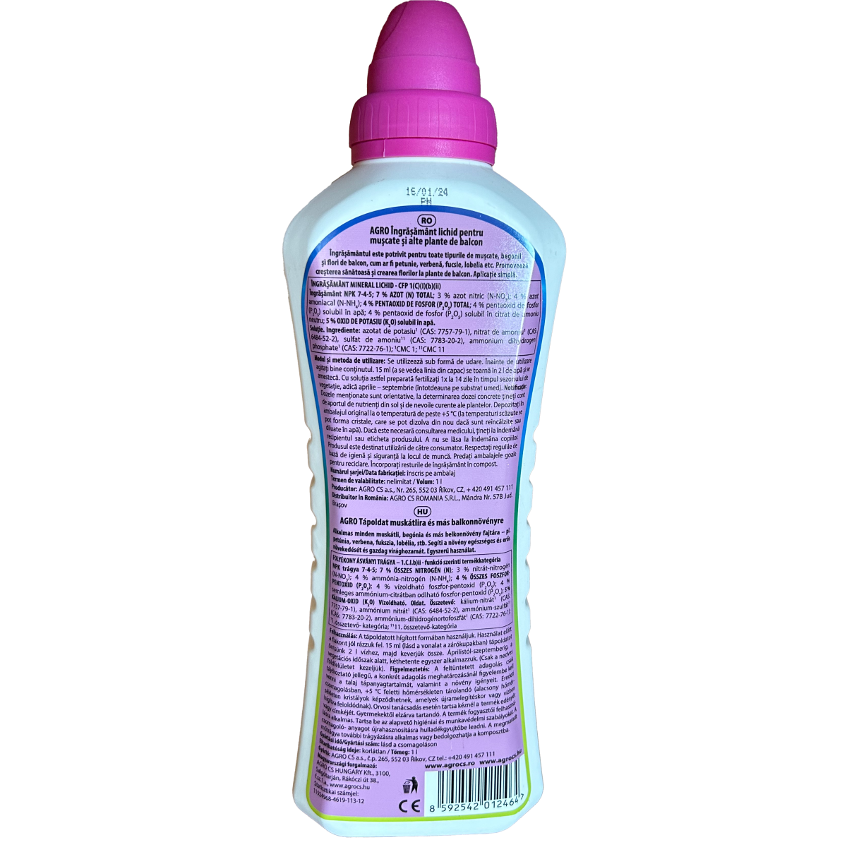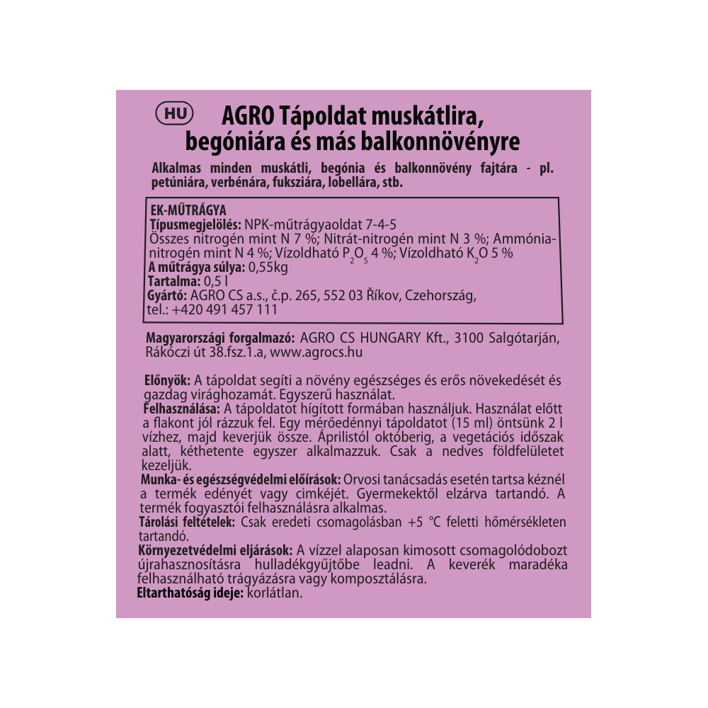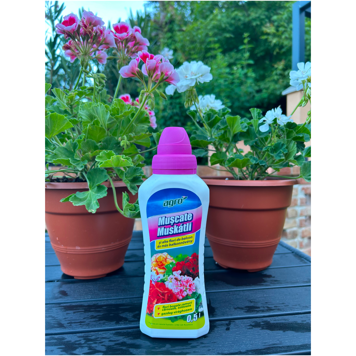Elősegíti a növények egészséges fejlődését és gazdag virágzását. Muskátli és a többi balkonnövény tápoldatozására, amelyek igényesek a tápanyagokra (petúniák, vasfű, begóniák, fukszia, bidens, stb.). Használjuk a tápoldatot 1x kéthetente az egész vegetációs idő alatt. Adagolás: 15 ml (egy zárókupak) 2 liter vízhez, alaposan elkeverve. Összetétel: nitrogén-foszfor-kálium (7-4-5). Az életképek tájékoztató jellegűek!