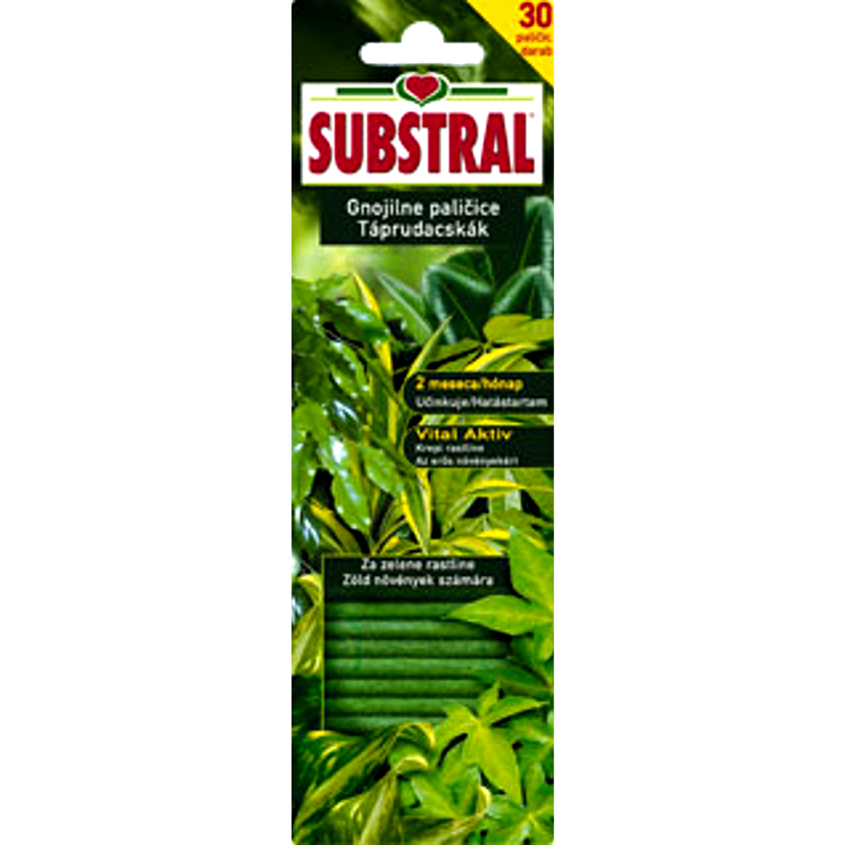 Substral zöld táprudacska. Két hónapon keresztül táplálja zöld növényeit! Zöld- cserepes dísznövények számára. Kész tápanyag a növények számára. Biztosítja a kiegyensúlyozott tápanyagellátást. Egyetlen alkalmazás 2 hónapra elegendő tápanyagot biztosít dísznövényei optimális fejlődéséhez- már csak öntöznie kell. A hozzáadott vas megelőzi a vashiányos állapotot és a levelek sárgulását. EK műtrágya. Felhasználás: szúrja a táprudacskát a földbe a növény köré a tövétől 5cm-re. Adagolás: cserépátmérőtől függően: 20cm cserépátmérő/1táprudacska; 30cm cserépátmérő/2táprudacska; 40cm cserépátmérő/4táprudacska; 50cm cserépátmérő/6táprudacska; 60cm cserépátmérő/8táprudacska.