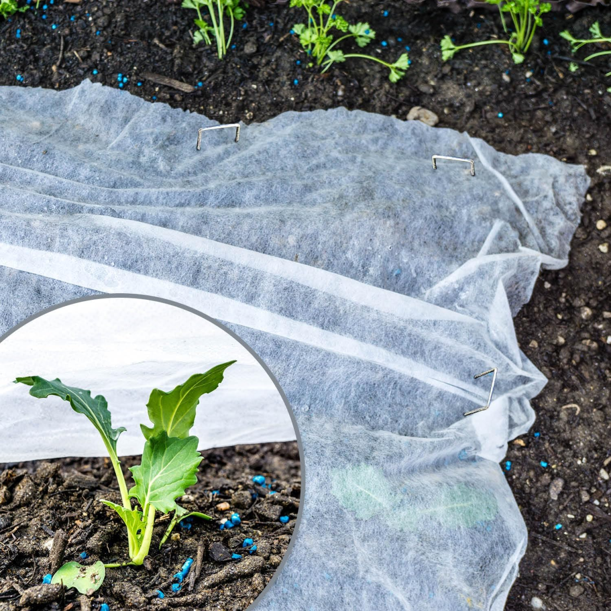 A fátyolfóliát közvetlenül vetés vagy ültetés után, lazán, feszítés nélkül terítsd a talajra. A széleket kb. 50 cm-enként terheld le vagy földeld le a hatékony védelem érdekében. A beporzást igénylő növényeket virágzáskor pár napra bontsd ki.