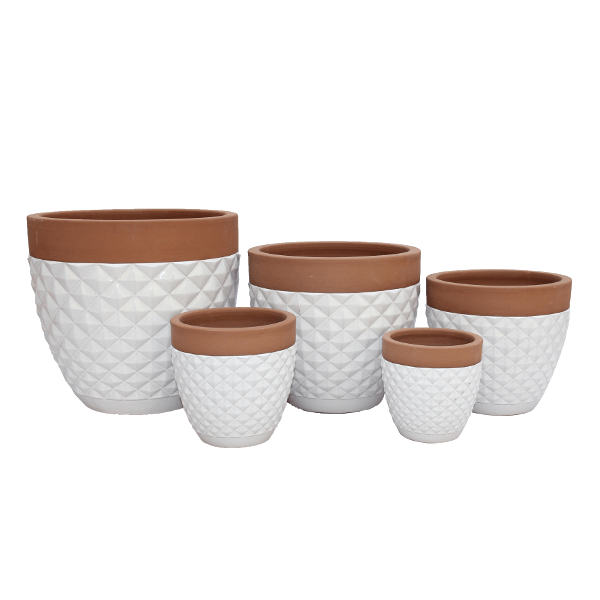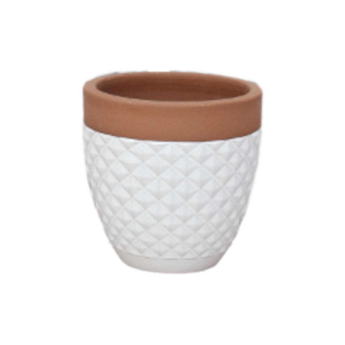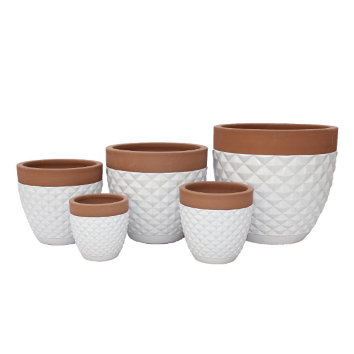 Agyag kaspó fehér gyémánt mintával, 37 x 34 cm méretben. A kaspók a kültéri és beltéri dekoráció fontos részei. Megteremtik szobánk vagy kertünk hangulatát. A virágtartónak különböző funkcióik vannak, így fontos, hogy a növényünknek megfelelő darabot válasszuk ki. Kínálatunkban a virágtartók és kaspók széles választékából válogathatunk.