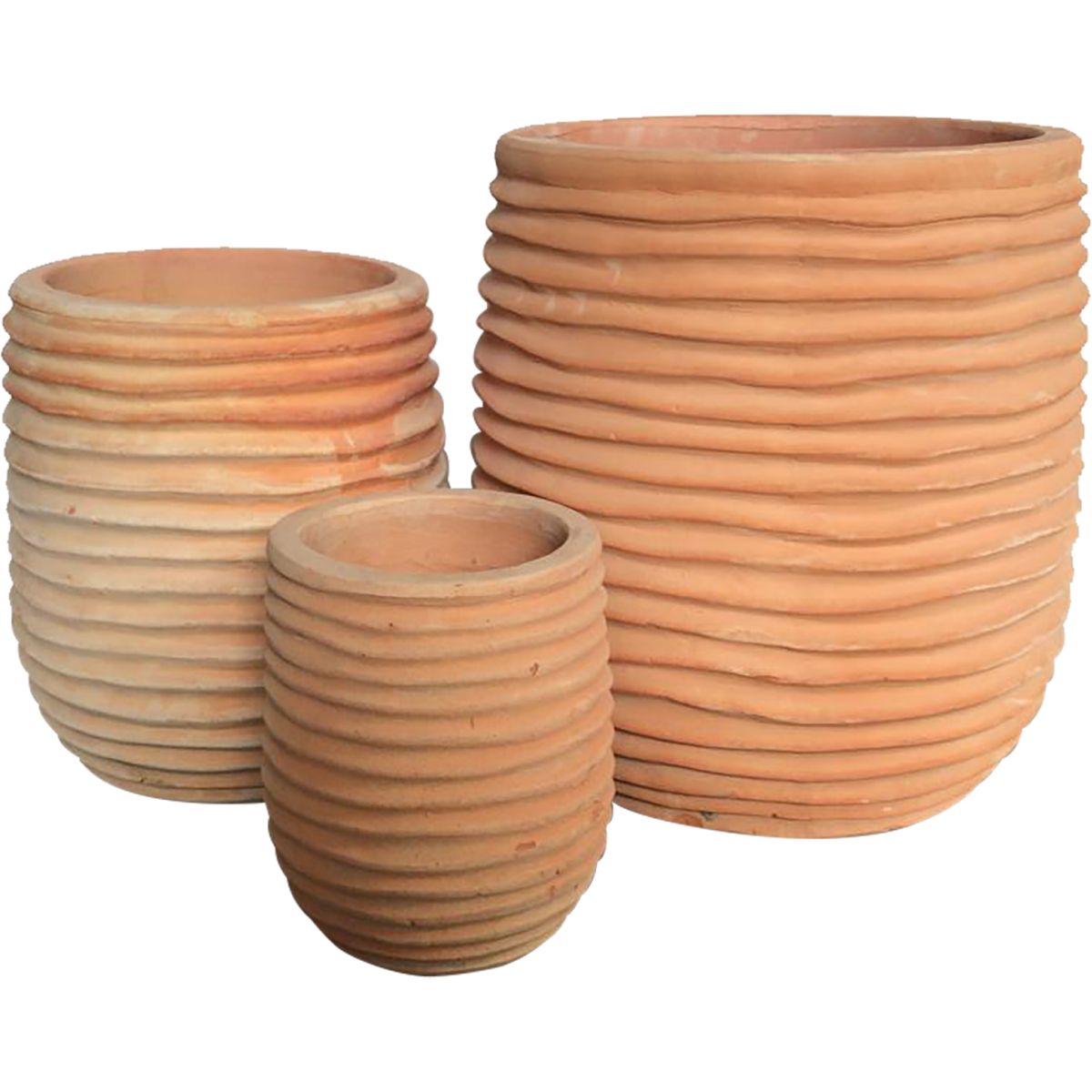 Agyag kaspó, hullámos felülettel, terracotta színben, nem vízálló.