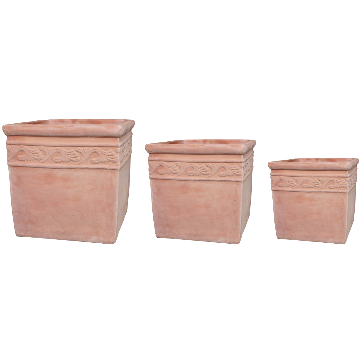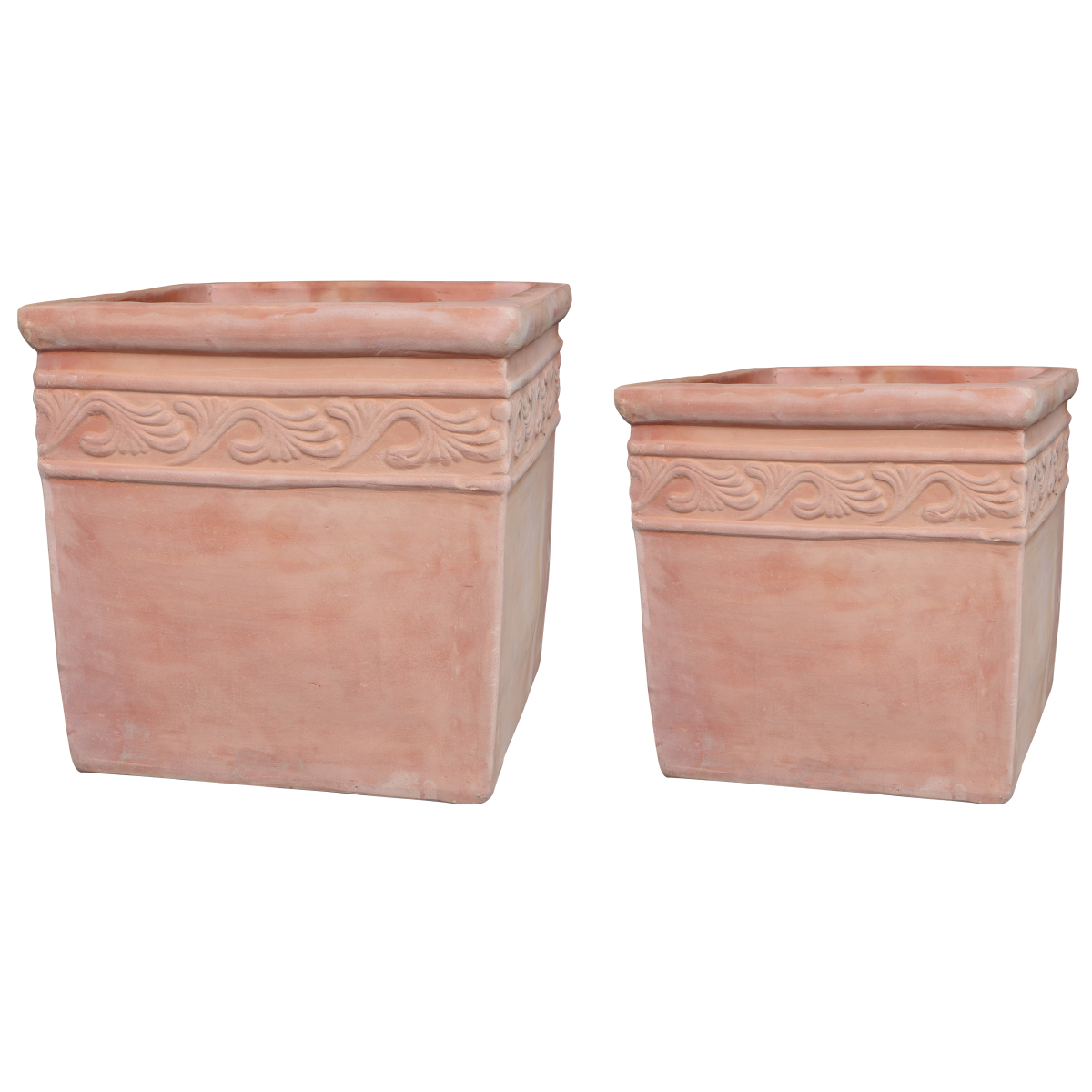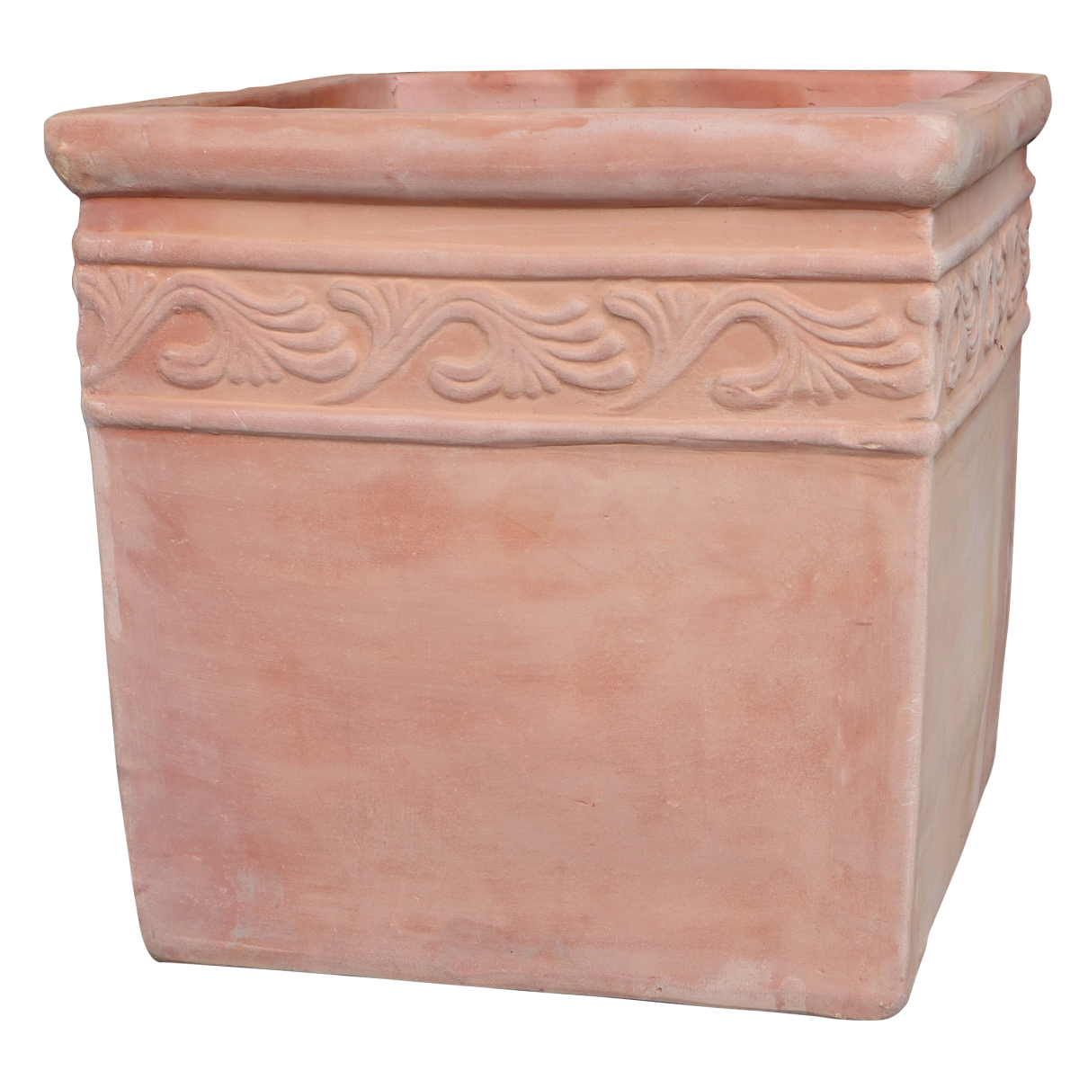Terracotta színű agyagkaspó szögletes formában, alul lyukasztva.