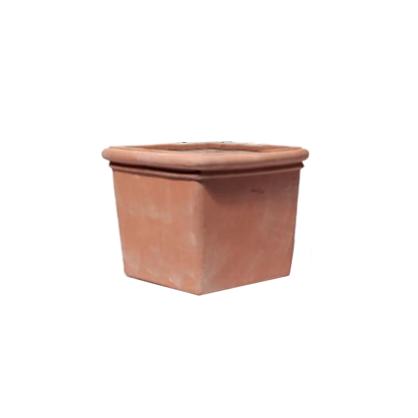 Terracotta színű agyagkaspó szögletes formában, alul lyukasztva.