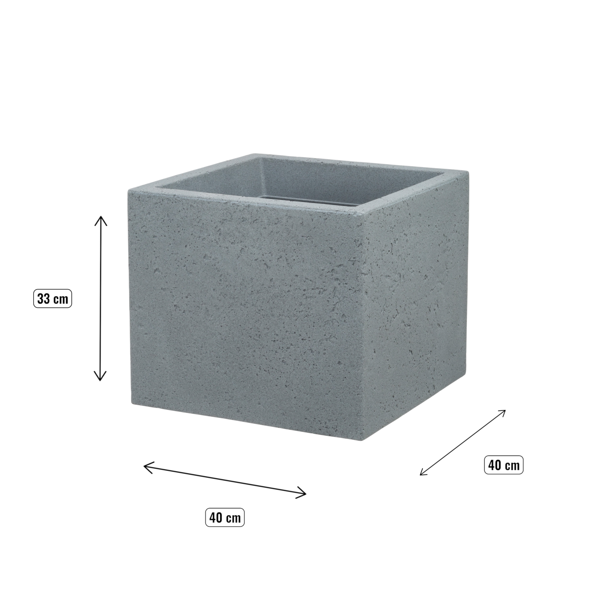 A C-Cube 40 cm-es szürke kaspó letisztult formavilágával és neutrális árnyalatával jól illeszkedik kortárs kertekbe, teraszokra és bejárati terekbe. Szögletes kialakítása rendezett megjelenést kölcsönöz, miközben tágas belső teret kínál, amely ideális akár nagyobb növények, cserjék vagy kisebb fásszárúak beültetéséhez is.