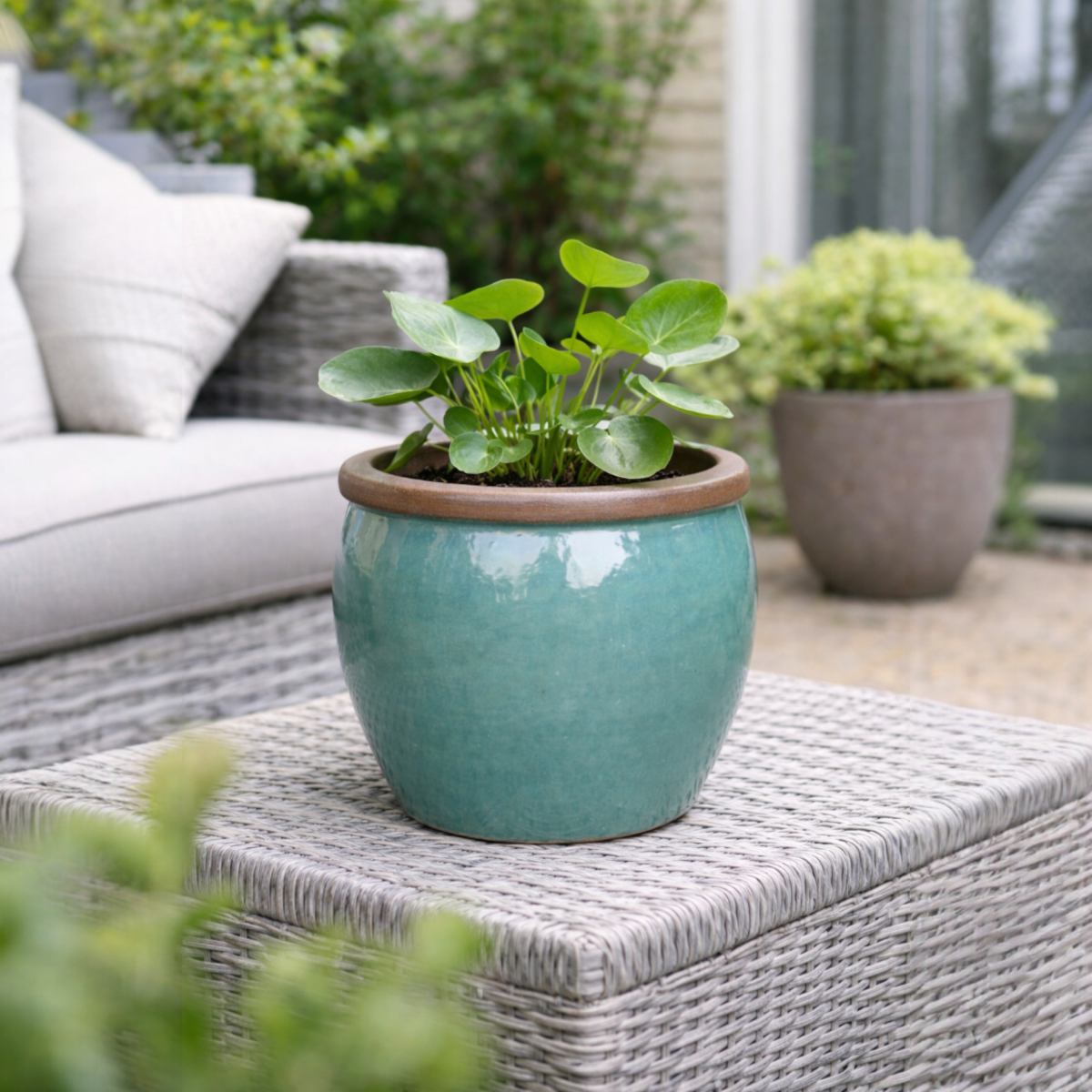 Ez a jade zöld színű kerámia kaspó elegáns, természetközeli árnyalatával tökéletesen illeszkedik modern és klasszikus környezetbe egyaránt. Letisztult formája kiemeli a benne elhelyezett növényeket, legyen szó beltéri dísznövényről vagy kültéri beültetésről.