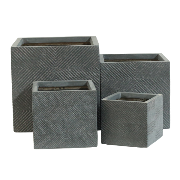 Kocka alakú kaspó, mérete: 29x29x27 cm, sötétszürke színben. Anyaga: magnesia 46%, magnesium 45%, üvegszál 5%.