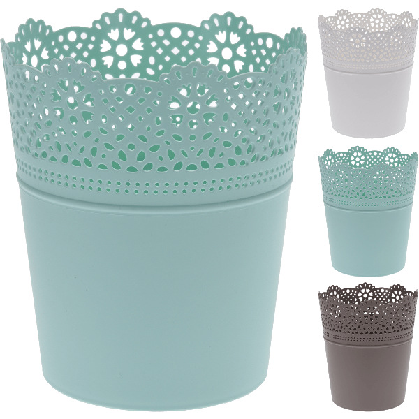 Műanyag kaspó csipke mintával, 3 féle modellben. Mérete: 13,5x15,5 cm.