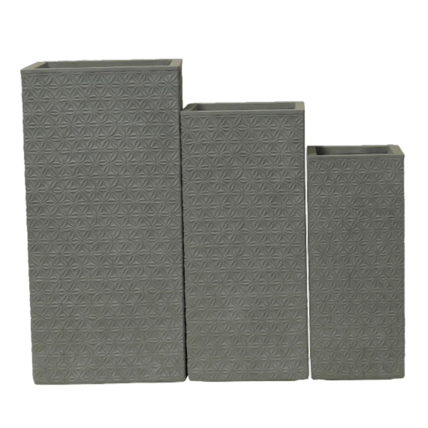 Magas négyzet alakú kaspó csillag textúrával, mérete: 34x34x70cm, anyag összetétel: magnézia 46%, magnézium 45%, üvegszálas 5%, rizsbőrpor 3%, vasoxid 1-2%.