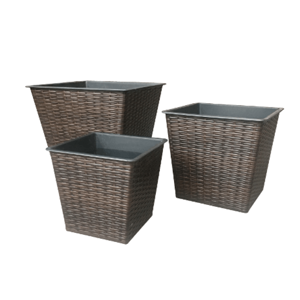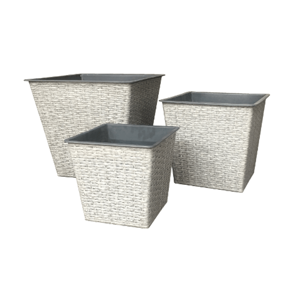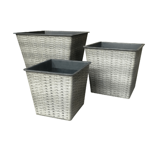 Műanyag kaspó, négyzet alakú, fonott hatású.