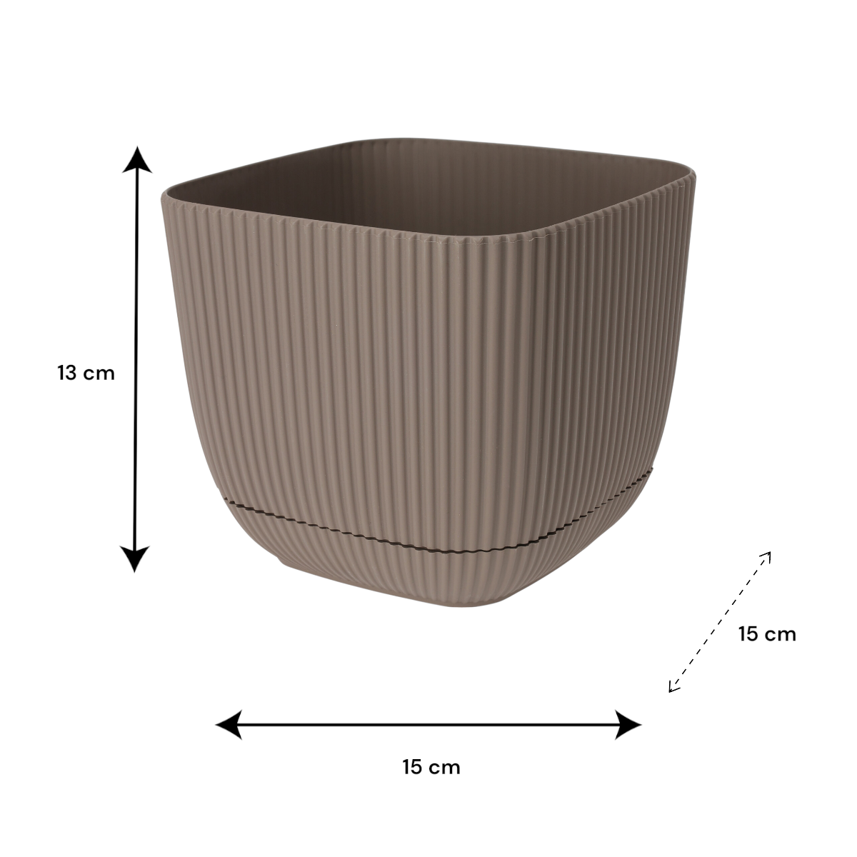 A szögletes műanyag virágcserép alátéttel praktikus és letisztult megoldás kisebb növények elhelyezéséhez. A 13 × 15 × 15 cm-es méret ideális lakásba és kültérre egyaránt, a hozzá tartozó alátét pedig segít a felesleges öntözővíz összegyűjtésében. Tartós polipropilén anyagból készül, fekete, bézs és barna színváltozatban érhető el.