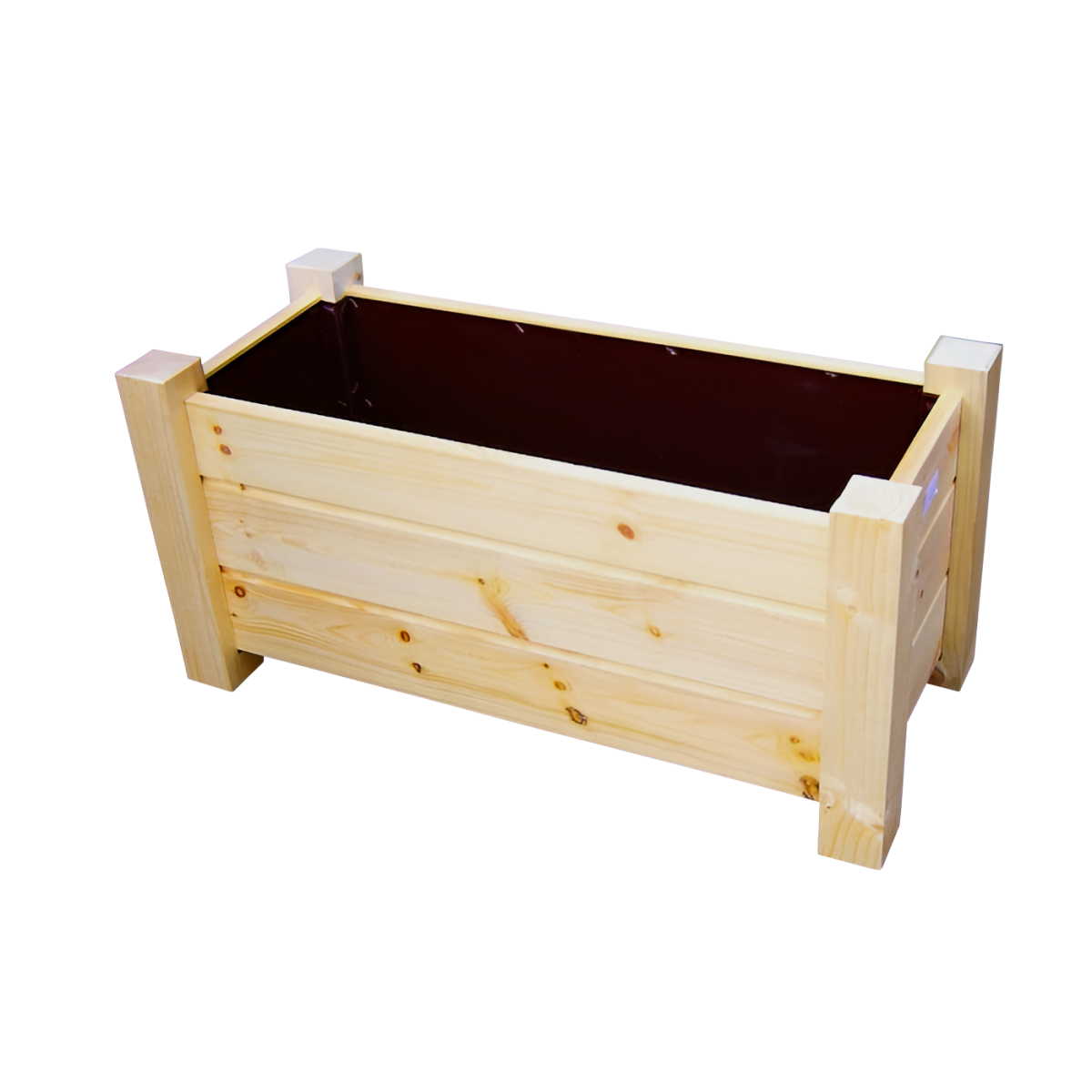 Natúr színű, kezeletlen fenyőfából készült, műanyag betéttel ellátott virágláda. A virágláda oldalfalai az oszloplábba mart mélyedésekbe illeszkednek, amivel kellő szilárdságot és stabilitást ad. A műanyag betétnek köszönhetően a nedves föld és a növények gyökerei nem érintkeznek a fával, így a láda gyors korhadása visszatartható. Ez a virágláda alkalmas kisebb örökzöld cserjék tartós beültetésére. Kezeletlenül csak beltéri, kezelést követően kültéri használatra is alkalmas. Ültetési mélység: 29.5 cm.