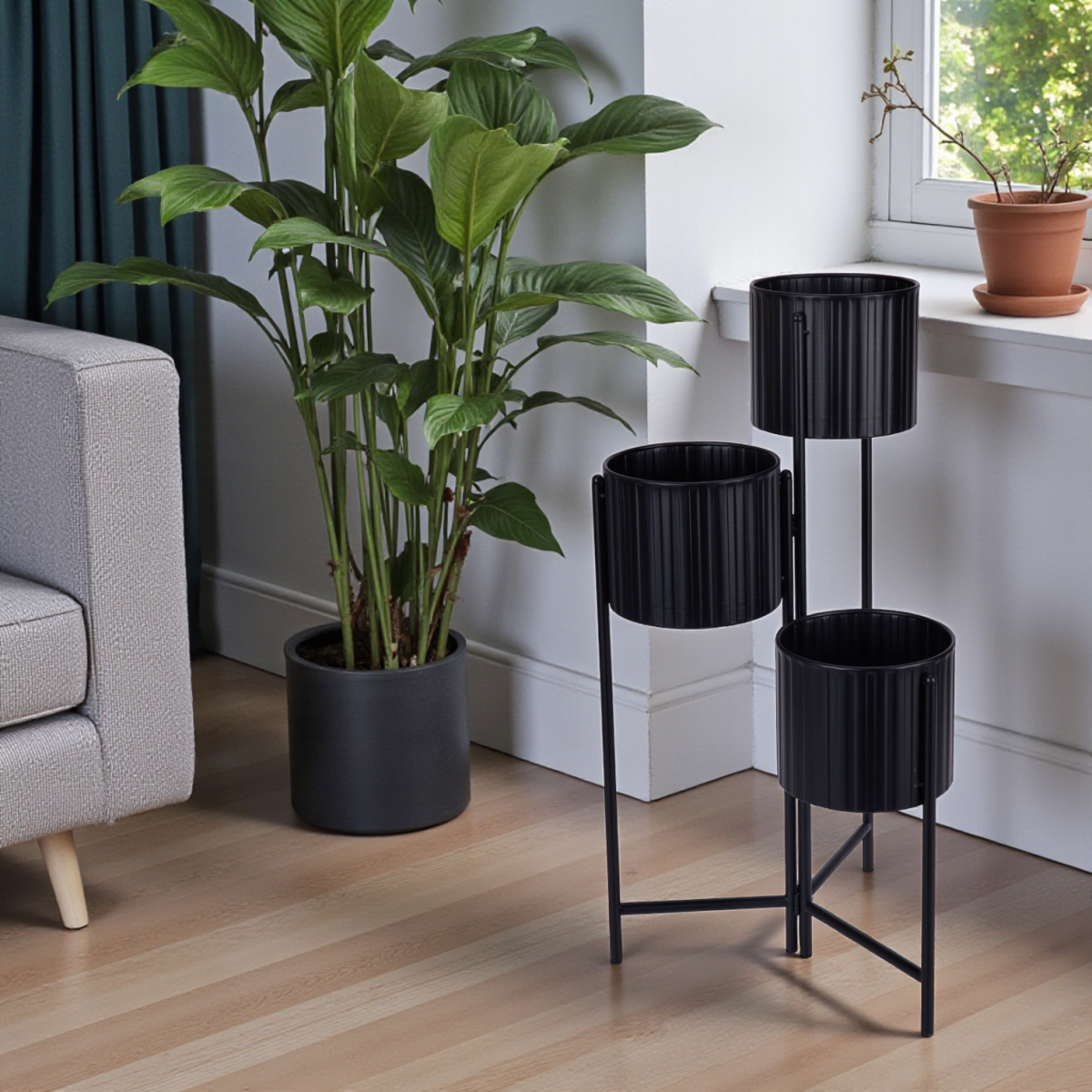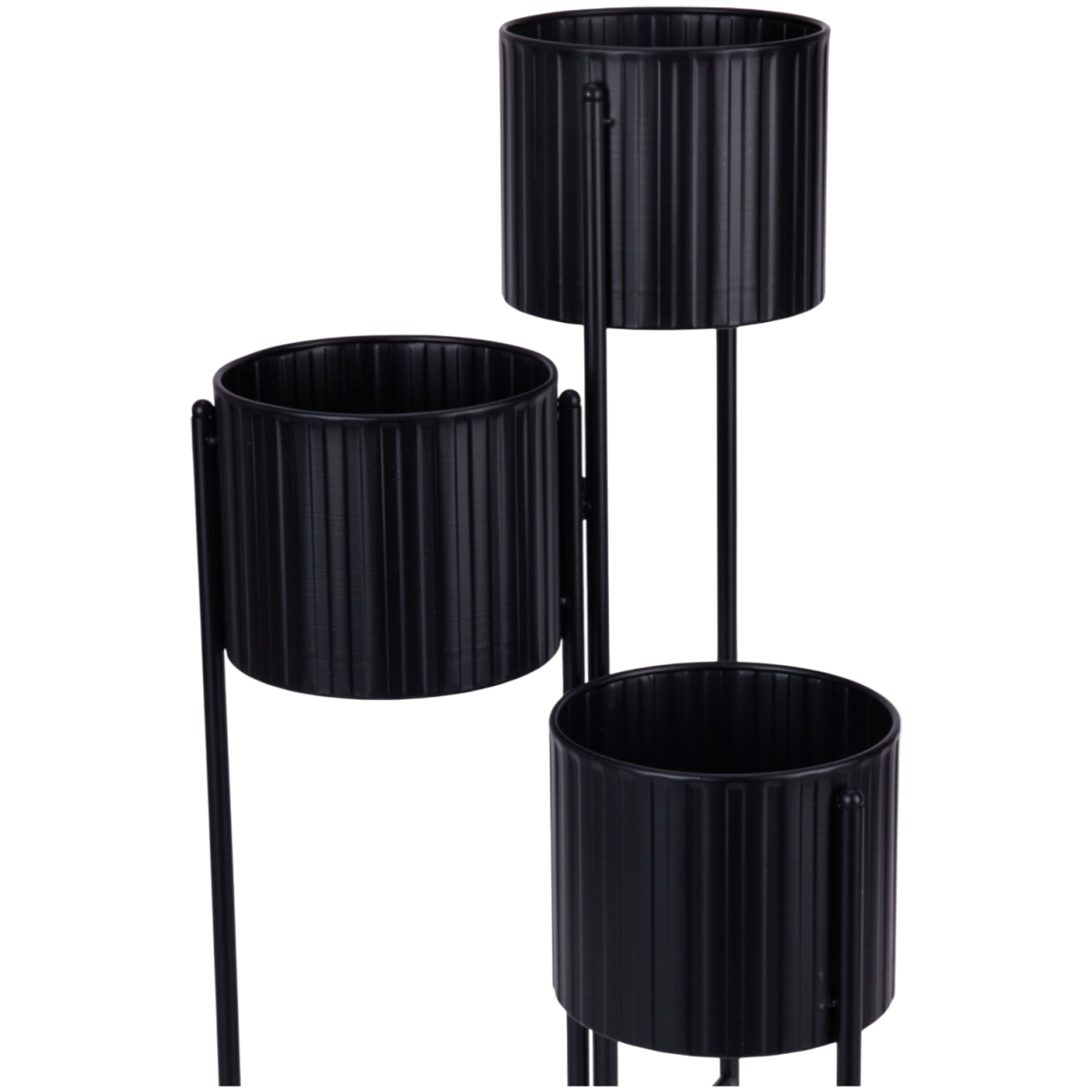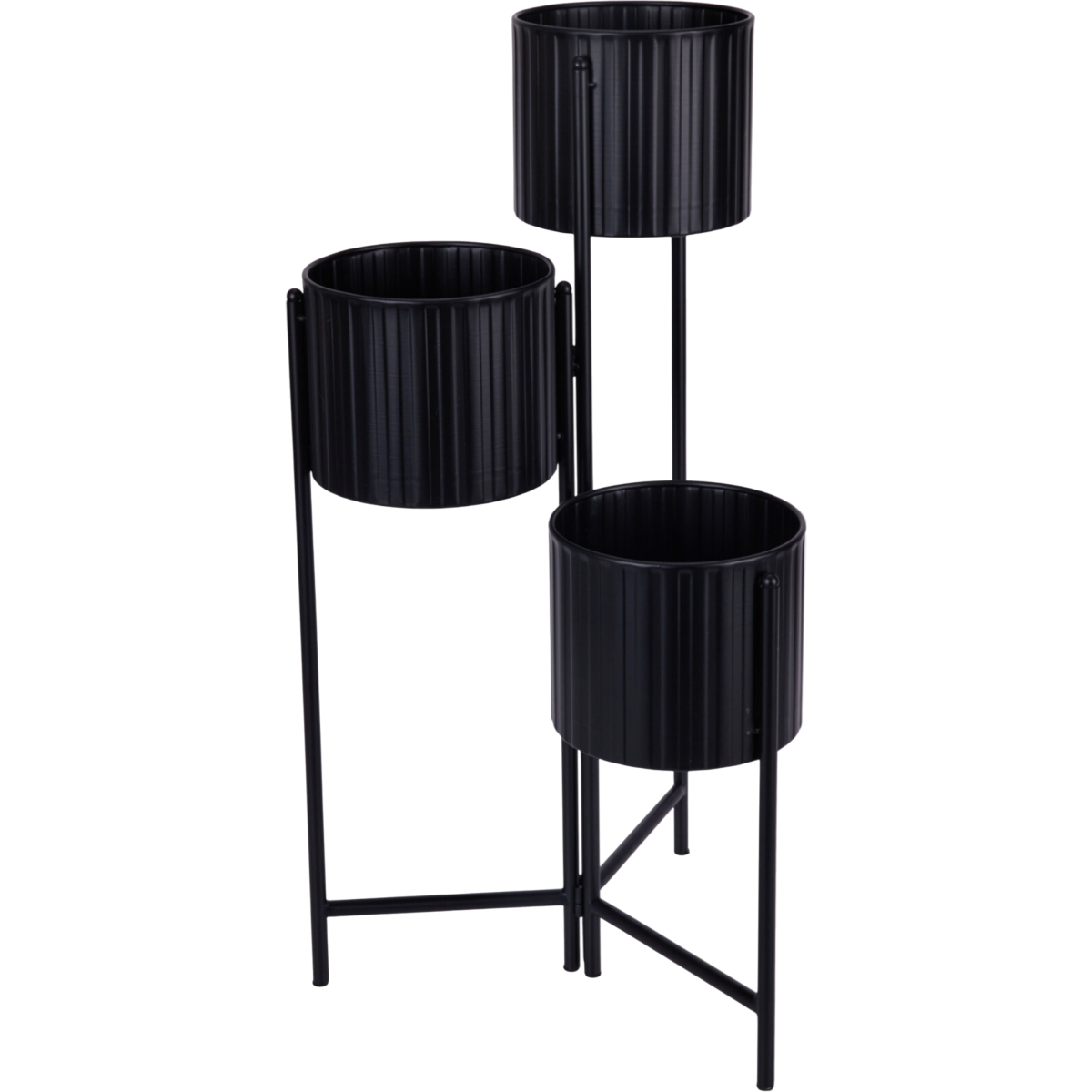 Ez a háromszintes, fekete színű fém virágtartó praktikus és rendezett megoldást kínál a növények elhelyezésére. A barázdált mintájú kaspótartók modern, letisztult megjelenést adnak, miközben a masszív vas szerkezet stabil tartást biztosít. A 25 cm átmérőjű kaspók számára kialakított tálcák lehetővé teszik, hogy többféle méretű és típusú növényt helyezz el egymás fölött, jól átláthatóan.