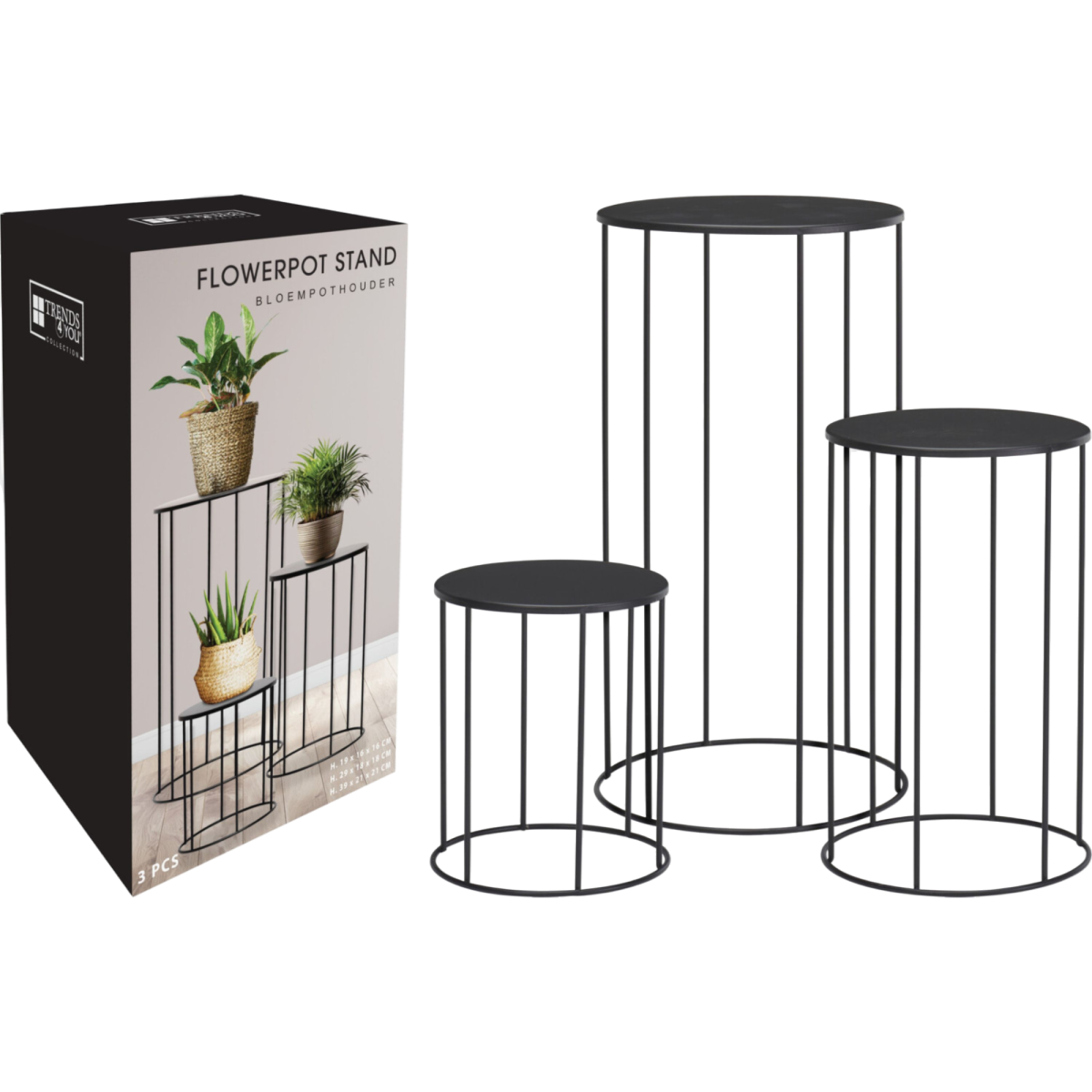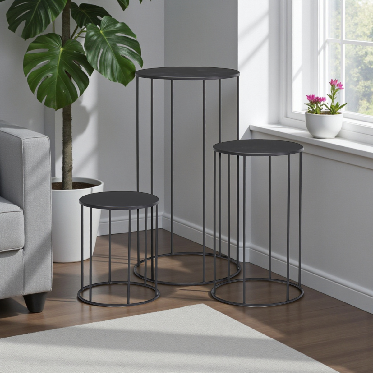 Fém virágtartó állvány szett – 3 darabos, letisztult fekete kivitel