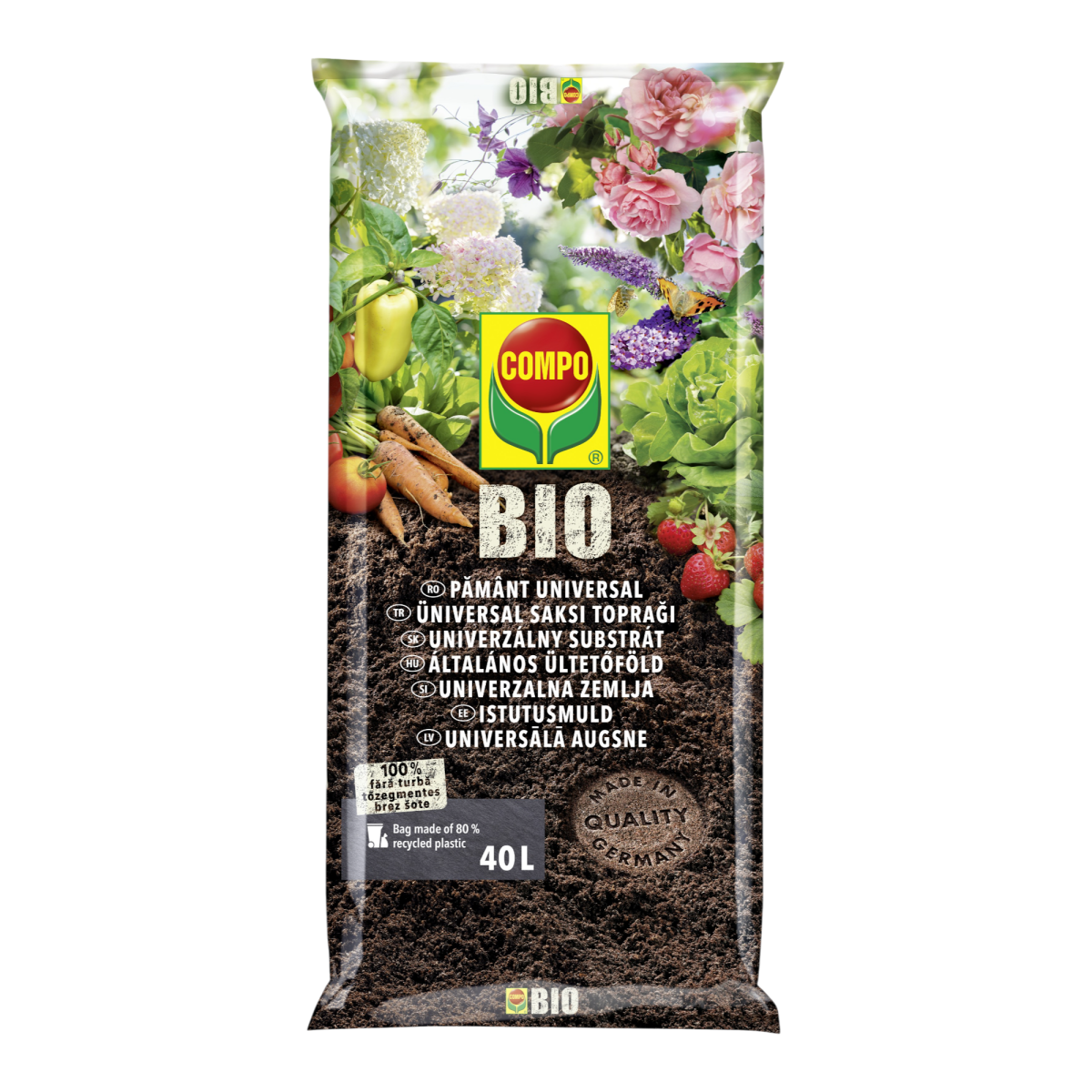 A Compo Bio univerzális virágföld egy tőzegmentes, 100%-ban természetes összetevőkből álló, kiemelkedő minőségű talajkeverék, amely alkalmas minden dísznövény, zöldség, gyümölcs és fűszernövény termesztéséhez.