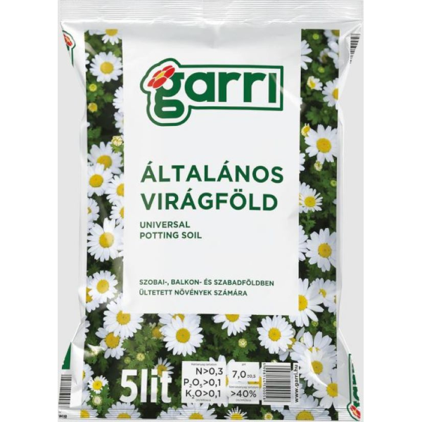 Felhasználható a savanyú termesztő közeget igénylő növények kivételével, minden dísznövény termesztő közegeként. A Garri általános virágföld természetes nedvességtartalma és szerkezete révén ideális körülményeket teremt a növények számára. A virágföld biztosítja a növény egészséges növekedését és a hosszantartó virágzását. Az alapanyagok összetétele jó öntözhetőséget és kiváló gyökérfejlődést biztosít A virágföld a növényeket utótrágyázás nélkül kb. 6 hétig ellátja a kezdeti fejlődéshez szükséges tápanyagokkal. Felhasználási időszak: egész évben.