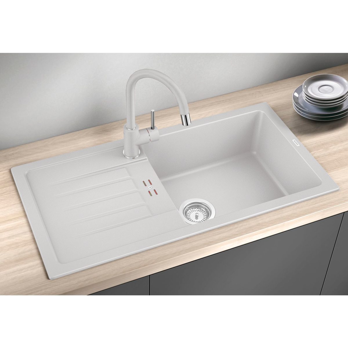 Az egymedencés kialakítás praktikus megoldást nyújt, míg a lefolyós csepptálca segíti a víz elvezetését és tisztán tartja a munkafelületet. A harmonikusan integrált túlfolyó növeli a medence hasznos térfogatát, a helytakarékos lefolyórendszer pedig több tárolóhelyet biztosít a mosogató alatti szekrényben. A prémium SILGRANIT anyag rendkívül karcálló, ütésálló és hőálló, emellett könnyen tisztítható és higiénikus.