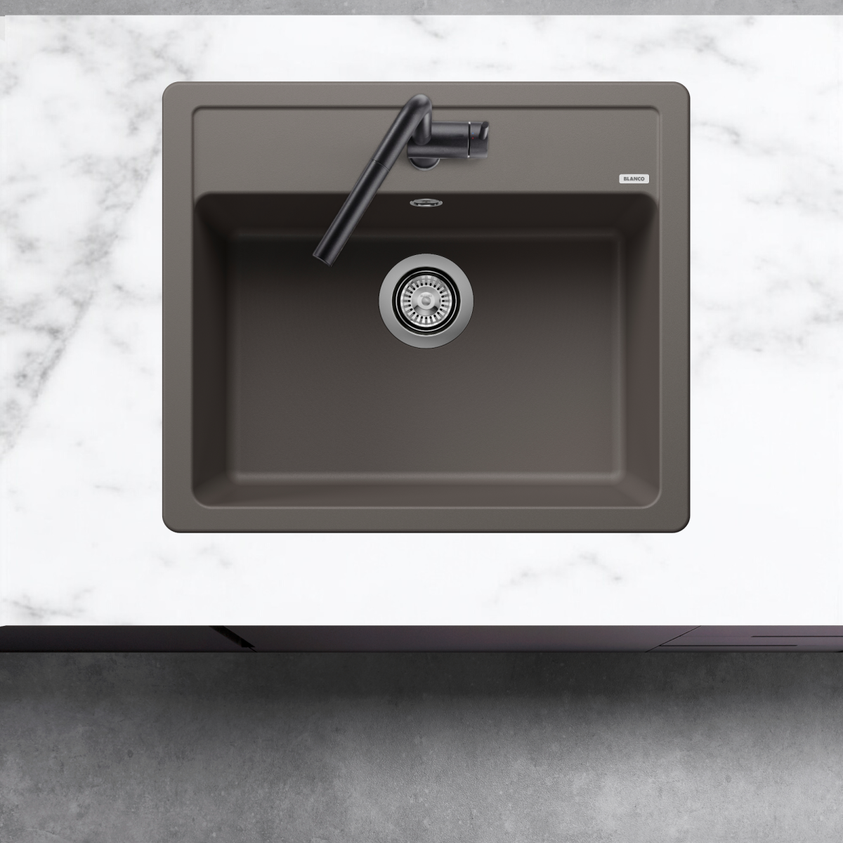 A Blanco Legra 6 egy egymedencés Silgranit mosogatótál, amely természetes hatású vulkánszürke színével harmonikusan illeszkedik különböző konyhai stílusokhoz. A 60 cm-es szekrénymérethez tervezett modell gyárilag egy furattal érkezik, a csomag tartalmazza a rögzítő körmöket, lefolyószettet és a túlfolyó takarót is.