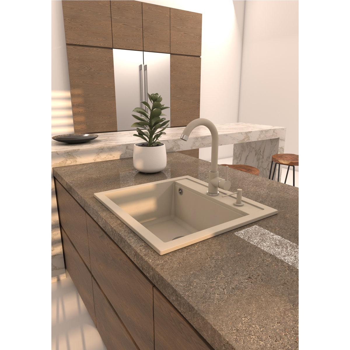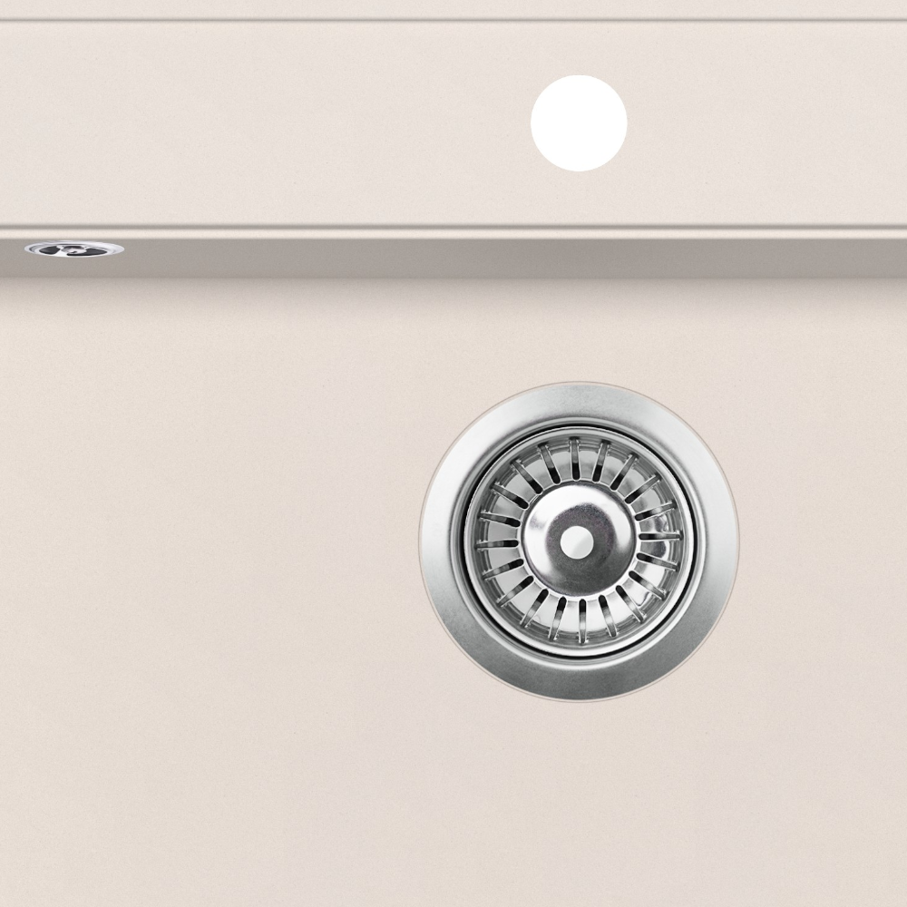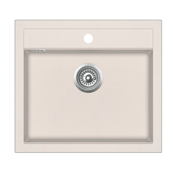 Evido Quadro 6 szögletes, egy medencés gránit mosogató bézs színben; lefolyóméret: 3,5". Egy csaplyukkal, hagyományos beépítés felülről, 60 cm-es szekrényméret; Alaptartozék: lefolyógarnitúra; a bűzelzáró szifon nem alaptartozék.