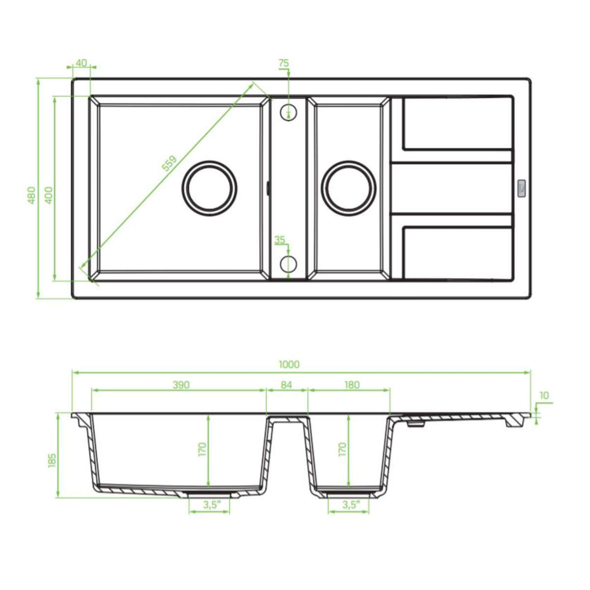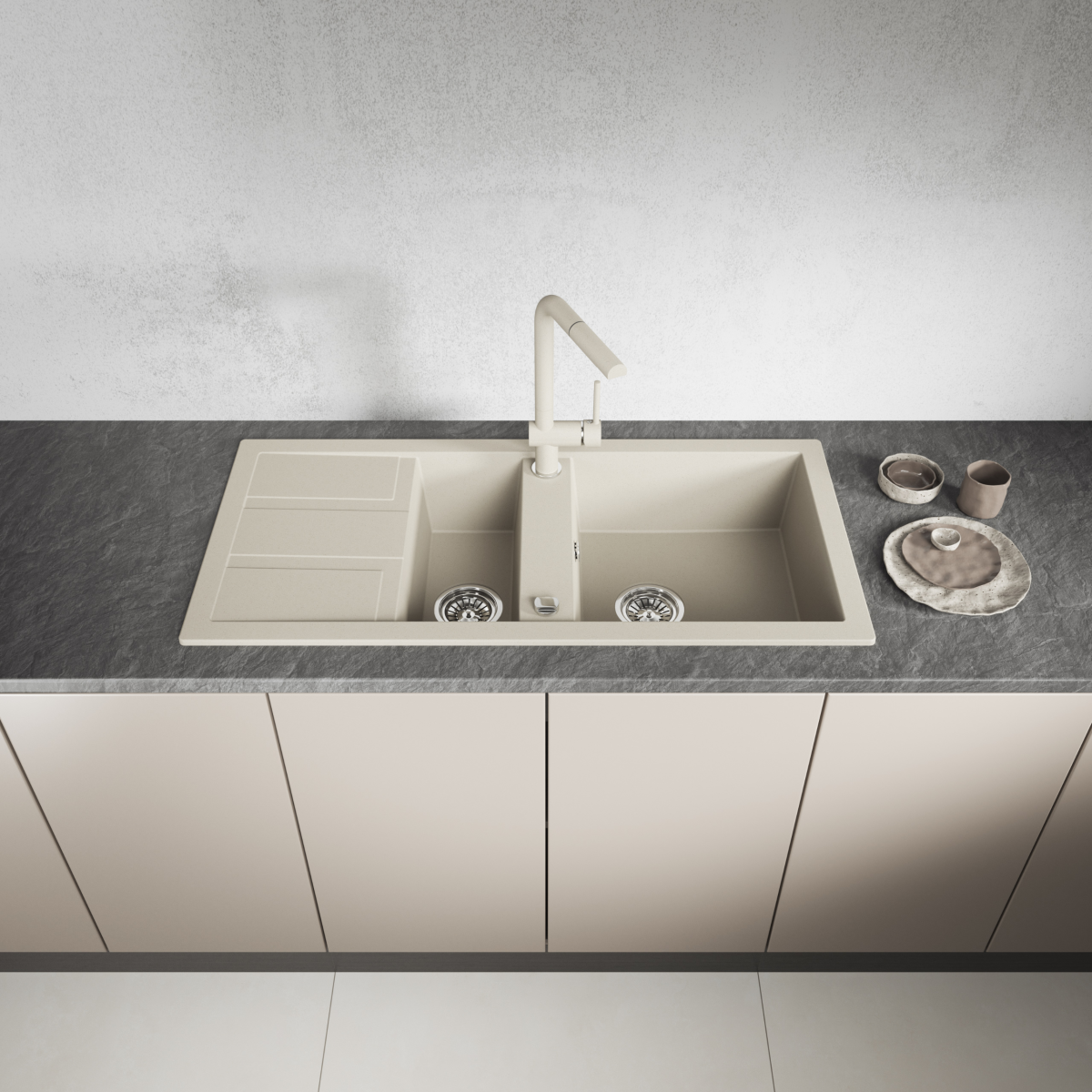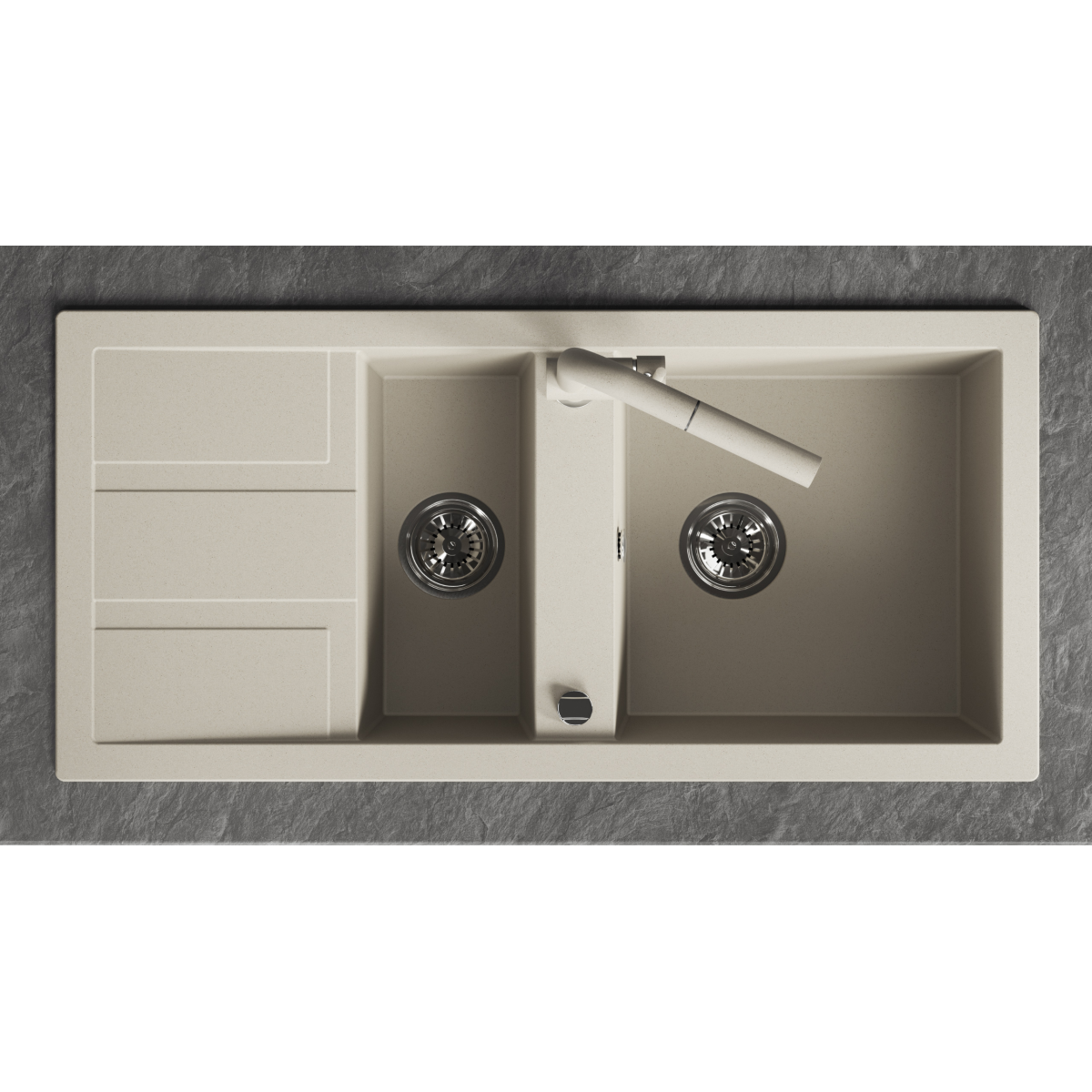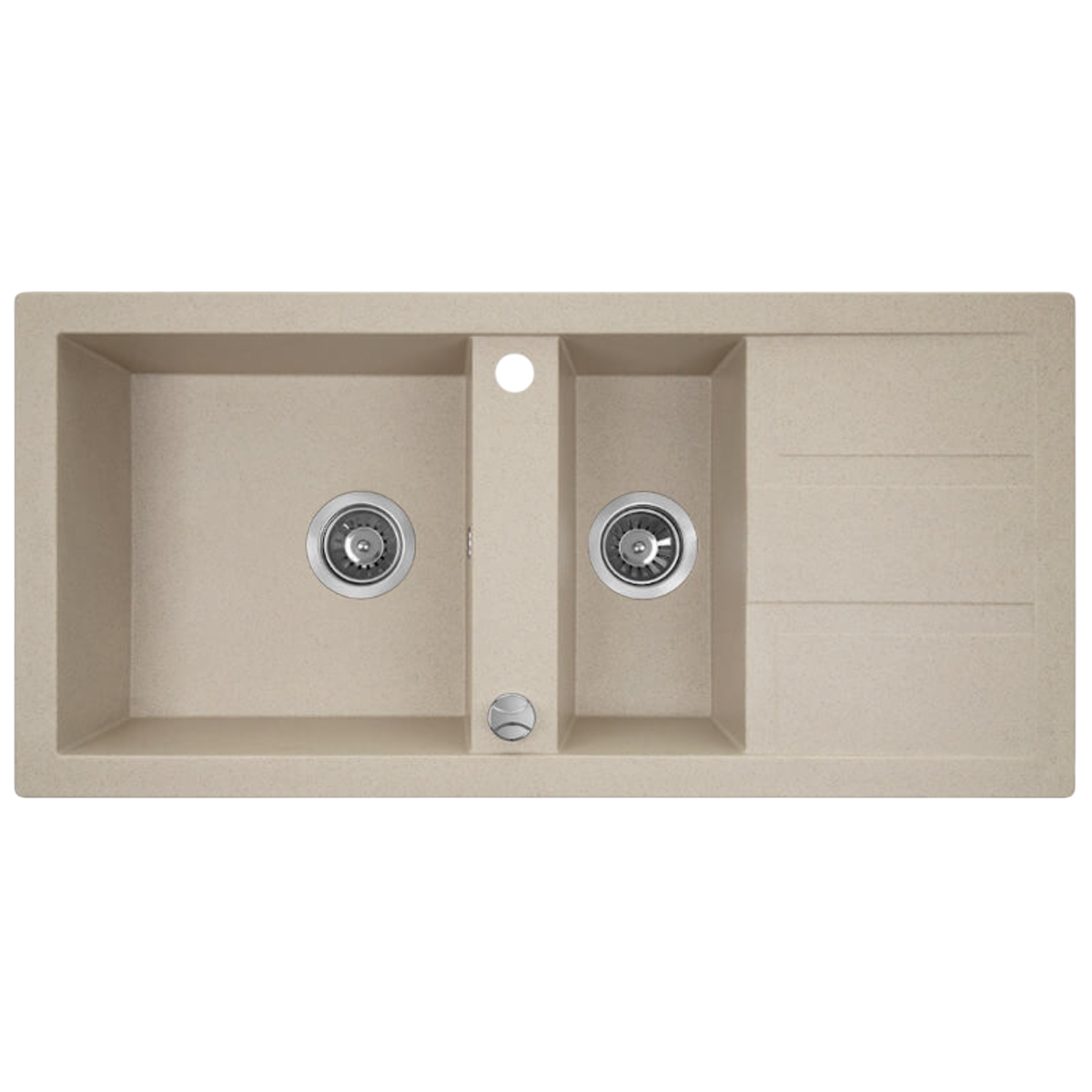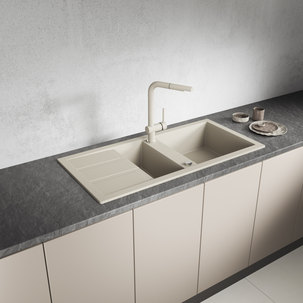 A Kuchinox Laveo Barbados 1,5 medencés, csepptálcás gránit mosogató kiváló választás tágasabb konyhákba, ahol fontos a praktikus elrendezés és a nagy munkaterület. A 100×48 cm-es méret kényelmes használatot biztosít, a bézs árnyalat pedig harmonikusan illeszkedik világosabb, természetes hangulatú konyhákhoz. A nagy és kisebb medence kombinációja segíti a párhuzamos munkavégzést, míg a csepptálca további előkészítő- és szárítófelületet kínál.