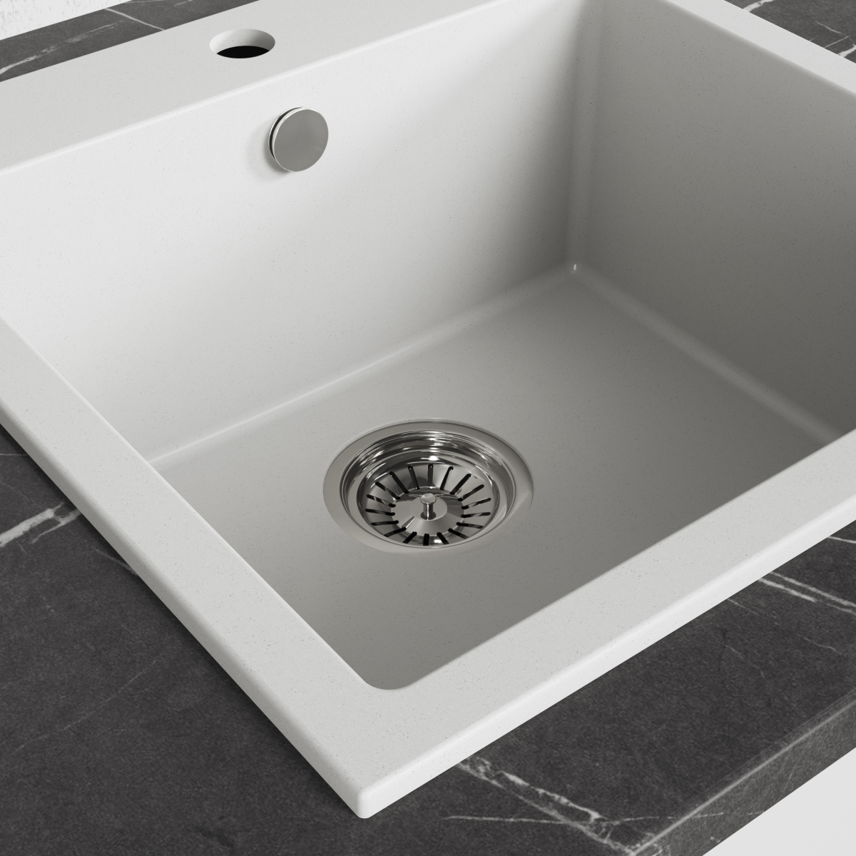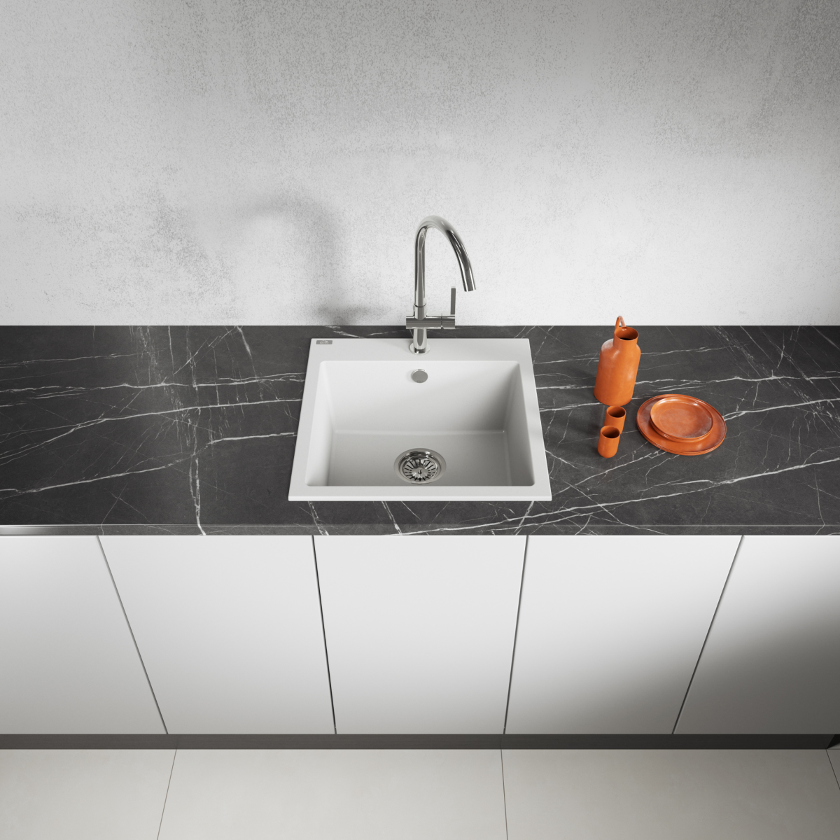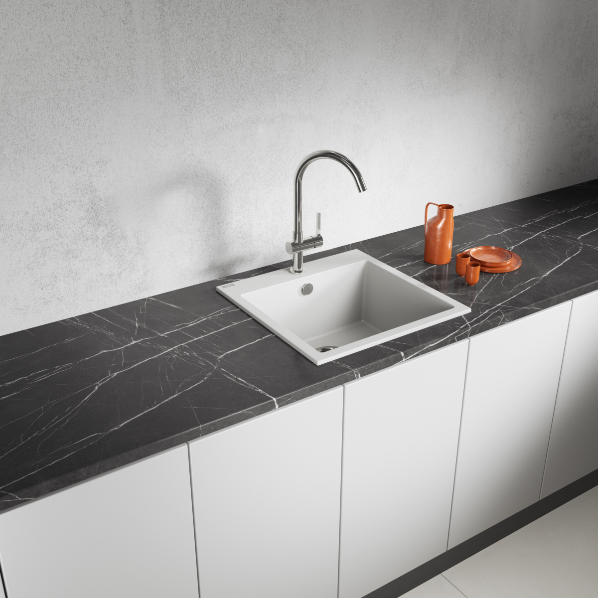 A Kuchinox Laveo Alena egymedencés gránit mosogató kompakt, mégis kényelmes megoldást kínál bármilyen modern konyhába. A 49×49 cm-es méretnek köszönhetően kis munkapultokon is jól elfér, miközben a 21,5 cm mély medence elegendő helyet biztosít a mindennapi mosogatási feladatokhoz. A fehér szín tiszta, világos megjelenést ad, amely harmonikusan illeszkedik klasszikus és modern enteriőrökbe is.