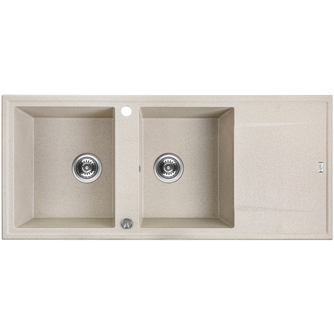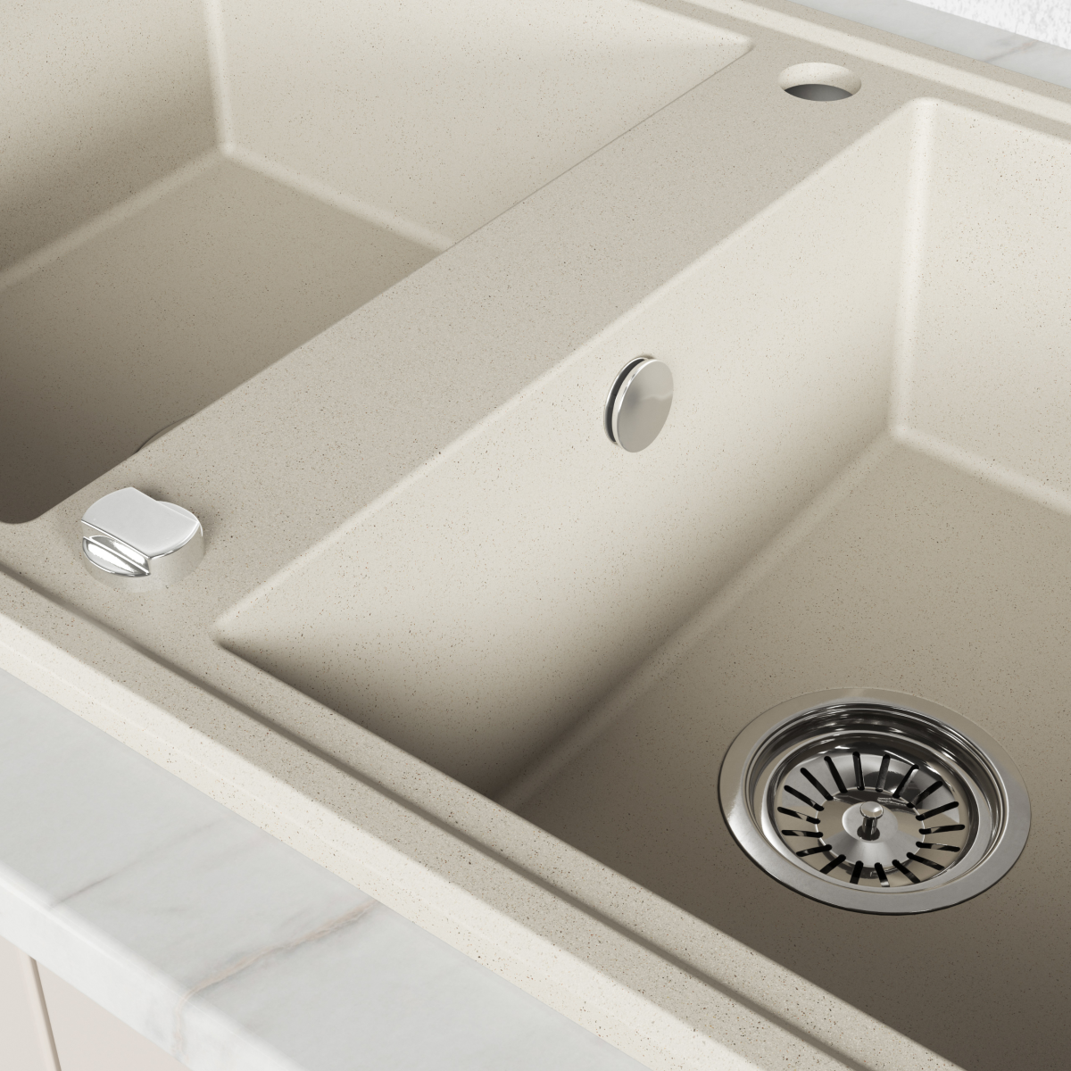 A bézs szín természetes, harmonikus megjelenést ad, a 116 cm-es szélesség pedig bőséges helyet biztosít az edények mosásához, öblítéséhez és szárításához. A csepptálca kényelmes felületet ad a lecsepegtetéshez, míg a két 17 cm mély medence jól használható még nagyobb fazekak vagy tálak esetén is. A helytakarékos, dugókiemelős szifon és a 3,5"-os szűrőkosaras lefolyó megkönnyíti a mindennapi használatot és a vízelvezetést.