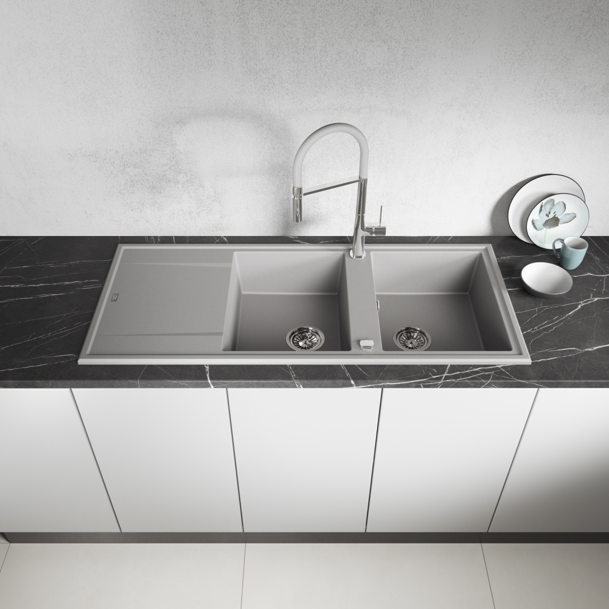 A Kuchinox Laveo Megalo kiváló választás, ha nagy méretű, kétmedencés, csepptálcás gránit mosogatót keresel szürke színben, jól átgondolt, kényelmes kialakítással.