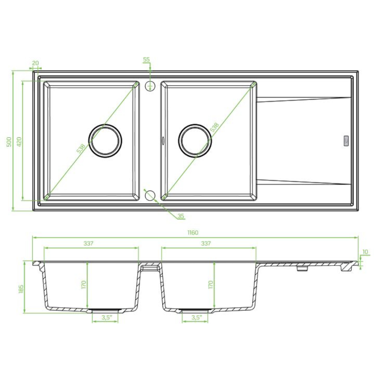 A szürke szín modern, letisztult megjelenést ad, a 116 cm-es szélesség pedig bőséges helyet biztosít az edények mosásához, öblítéséhez és szárításához. A csepptálca kényelmes felületet ad a lecsepegtetéshez, míg a két 17 cm mély medence jól használható még nagyobb fazekak vagy tálak esetén is. A helytakarékos, dugókiemelős szifon és a 3,5"-os szűrőkosaras lefolyó megkönnyíti a mindennapi használatot és a vízelvezetést.