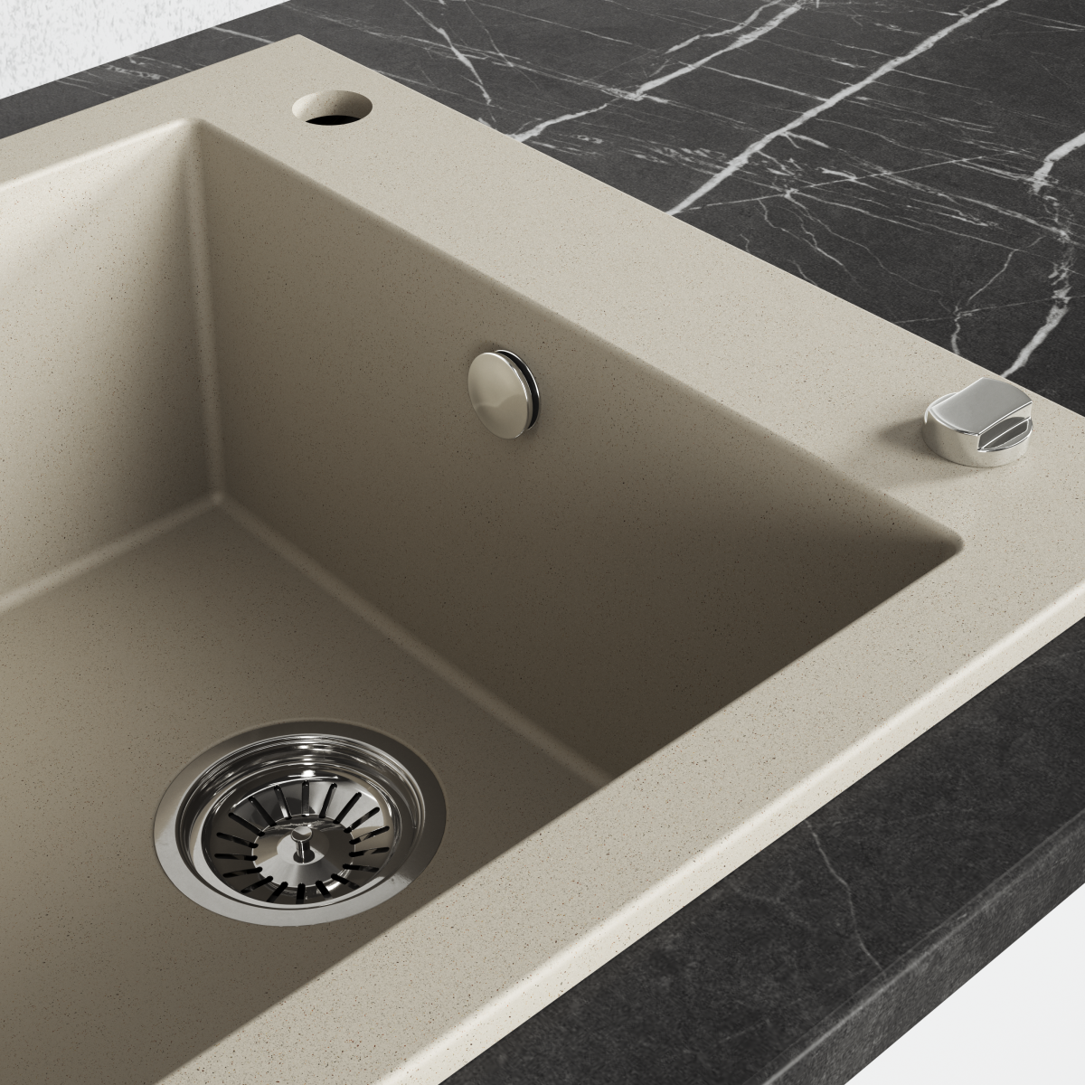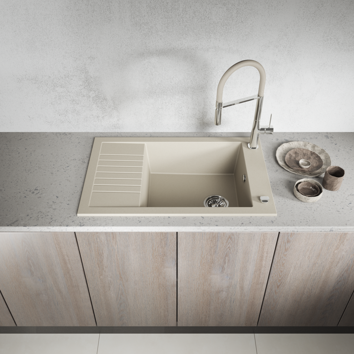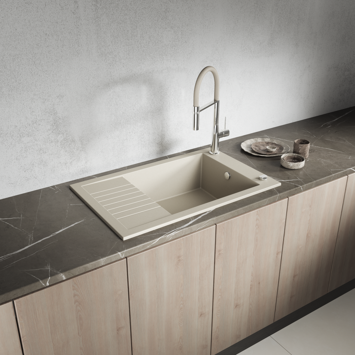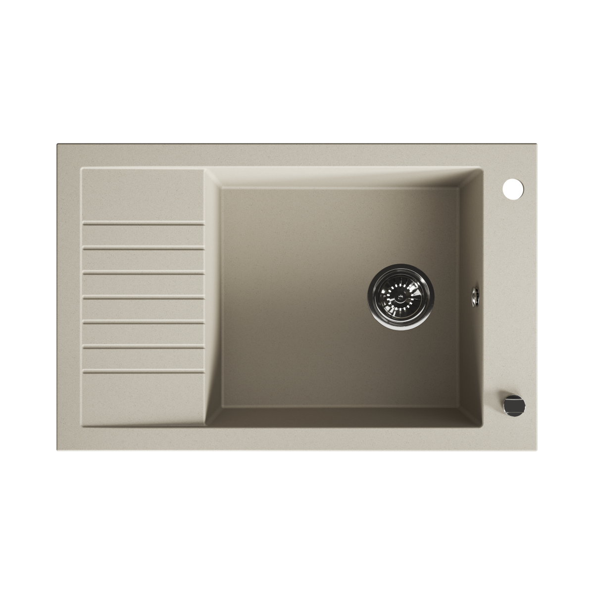 A nagy medence kényelmes helyet ad a nagyobb edények, tepsik vagy lábasok mosogatásához, miközben a mini csepptálca kompakt megoldást nyújt a lecsepegtetéshez. A bézs szín letisztult, kellemes megjelenést biztosít, a helytakarékos dugókiemelős szifon pedig hatékony vízelvezetést tesz lehetővé a 3,5"-os szűrőkosaras lefolyóval együtt.