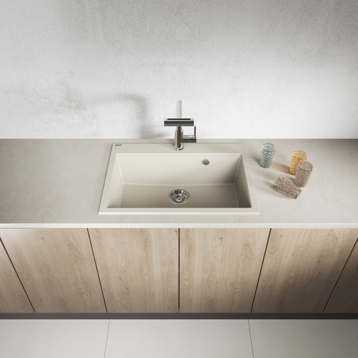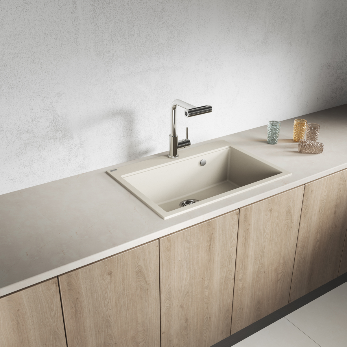 Letisztult, nagy medencés kialakítású gránit mosogató, amely kényelmes mosogatási teret biztosít akár nagyobb edényekhez is. A bézs szín elegáns és időtálló, így könnyen illeszthető modern vagy klasszikus konyhai környezetbe. A 70 cm széles, mély medence praktikus mindennapi használat mellett, a felülete pedig ellenálló és könnyen tisztítható.