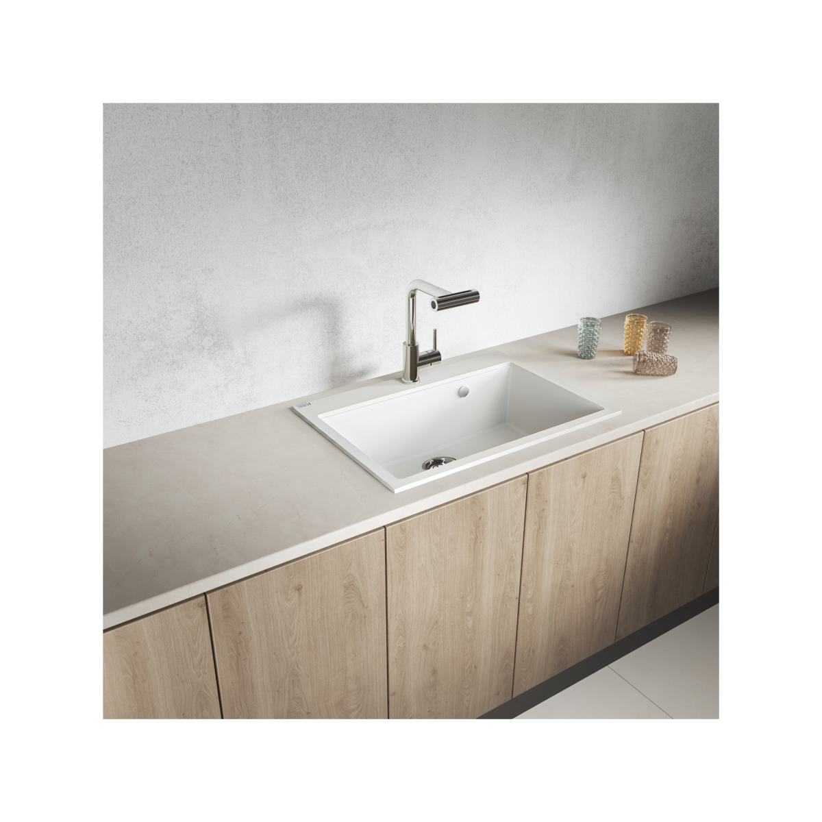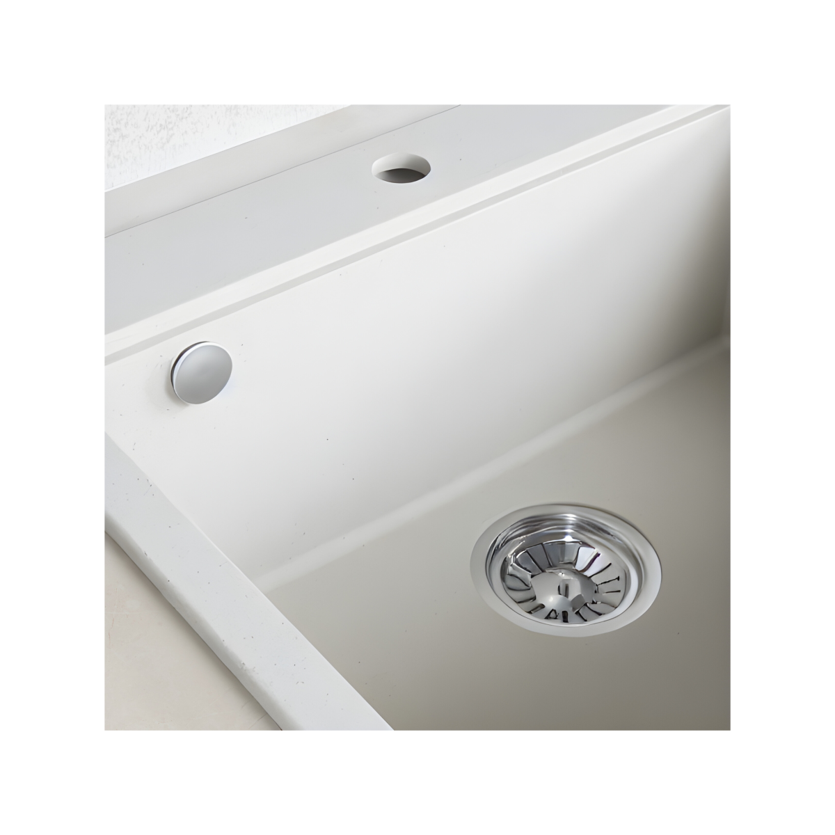 A TAU 8 fehér gránit mosogató letisztult, modern megjelenést ad a konyhának, miközben extra tágas, 80 cm-es medencéjével kényelmes munkateret biztosít a mindennapi használathoz. Nagy mérete ideálissá teszi nagy edények, tepsik és tálak mosogatásához, a fehér felület pedig világosabb, elegáns összhatást teremt a konyhapulton.