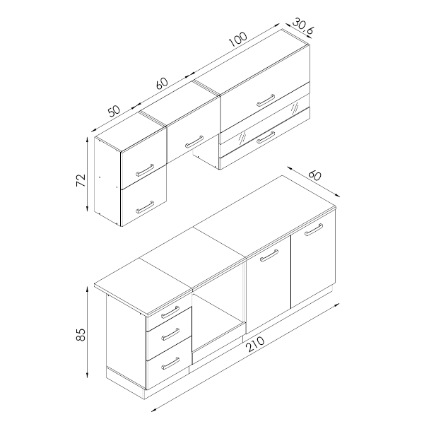 Laminált faforgácslap anyag 16mm vastag, Felsőszekrény: 720mm. Műanyag foganytúk, fém vasalatok, görgős fiókrendszer, 2,1m munkalap, 210cm hosszú blokk. A Vivien szett a modern dizájn elveinek megfelelően tervezett szett. A fehér szín és a fa kombinációja egyediséget és meleget ad a szobának. A fekete fogantyúk a modern dizájnt hangsúlyozzák, míg a 60 cm-es szekrényben tágas, fiókos szekrényben minden szükséges tartozékok elférnek.