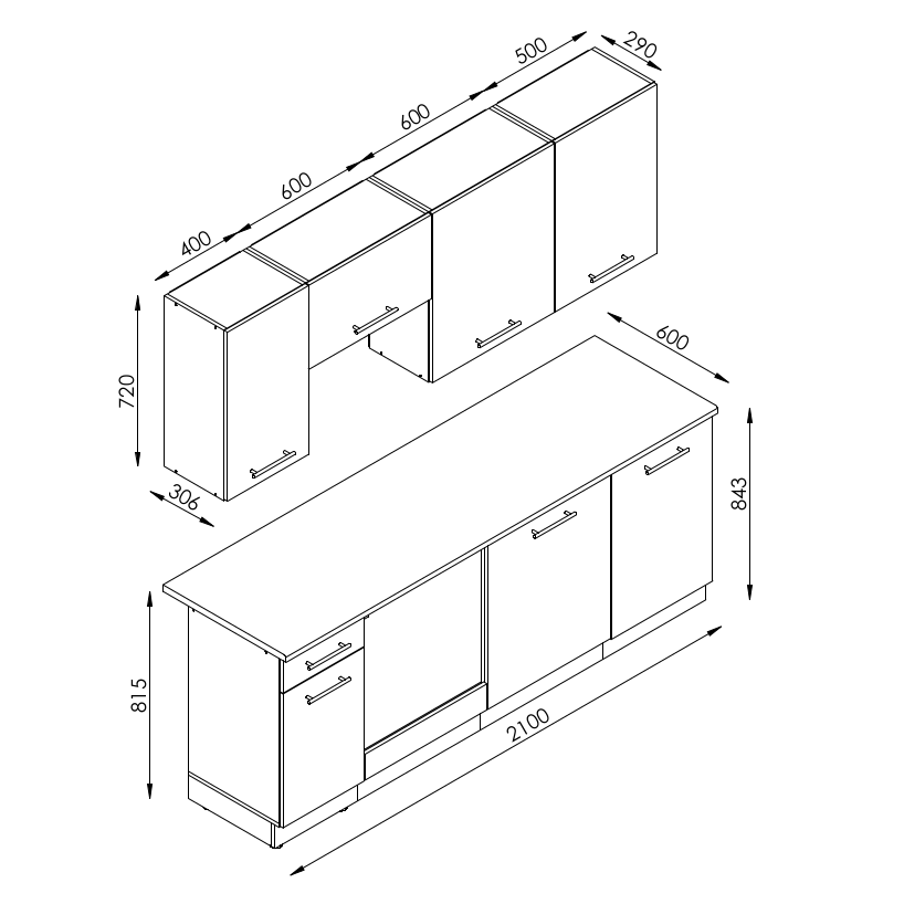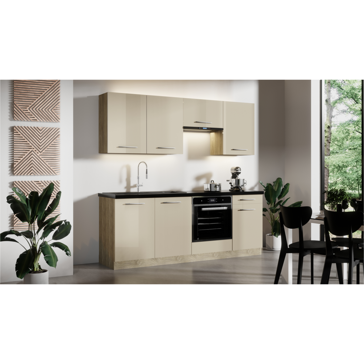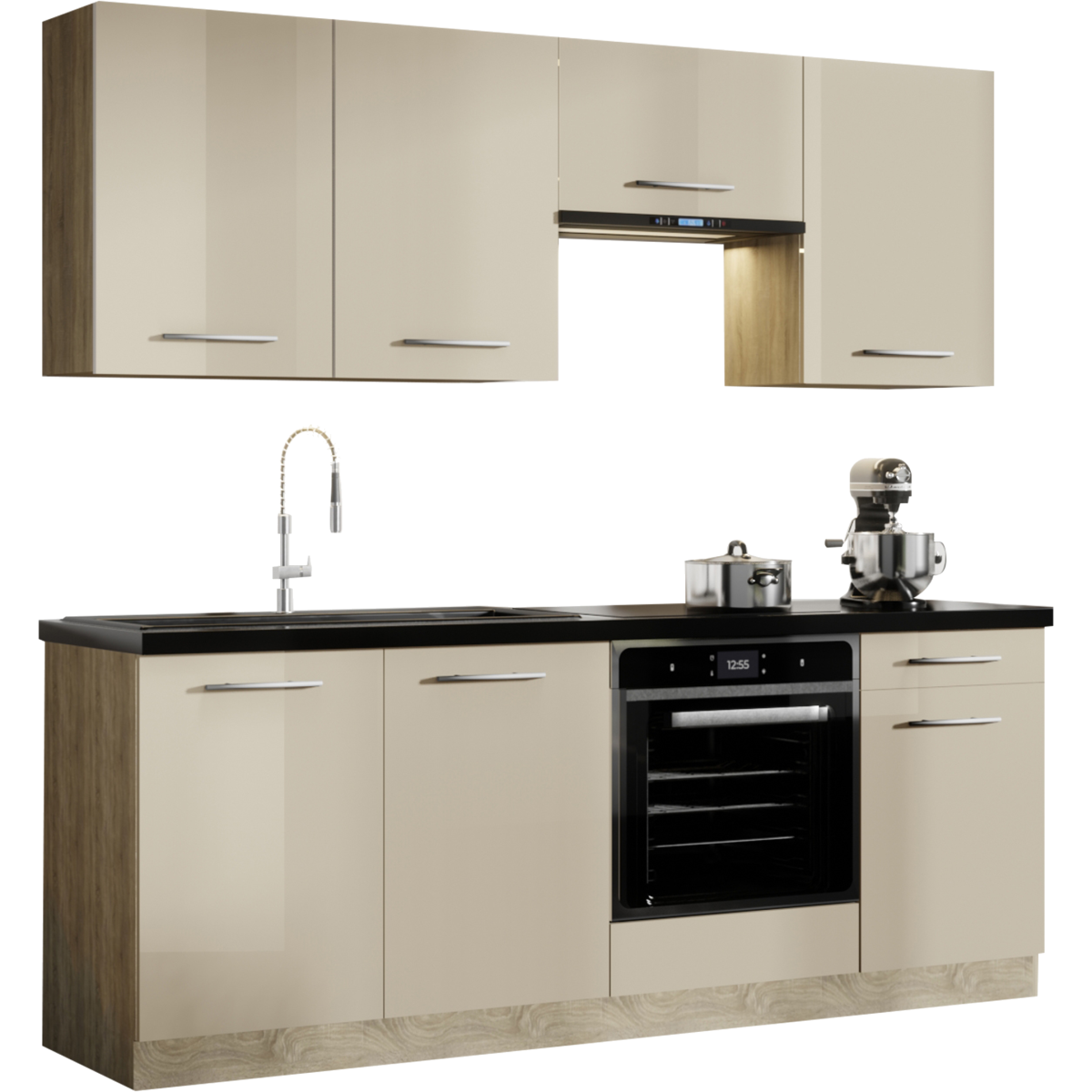 Capri konyhablokk, 210 cm széles, szatén színű. A kép csak illusztráció! Konyhagépek, mosogató, munkapult és csaptelep nélkül értékesítjük!